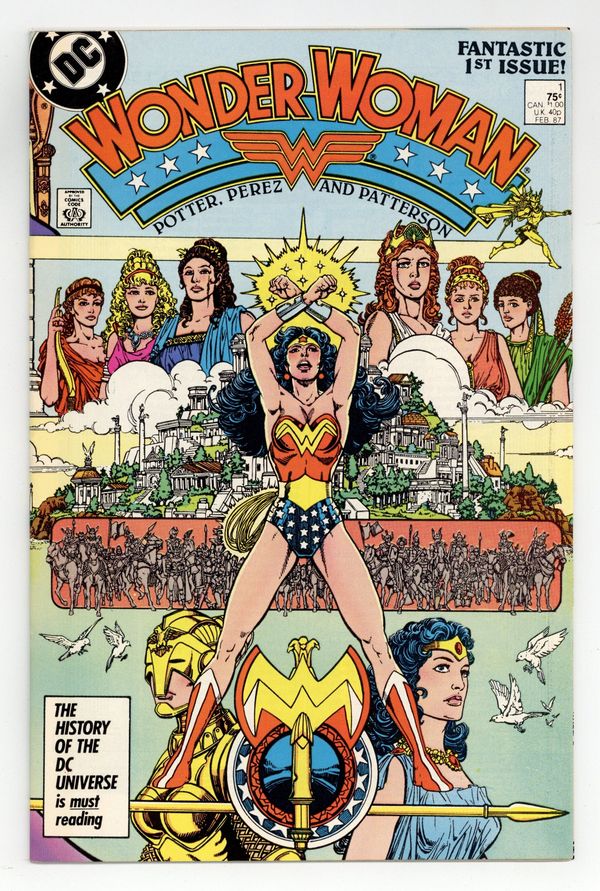 Starts Feb 2 Direct Edition. In this post-Crisis on Infinite Earths re-imagining of the Wonder Woman mythos, Diana is born of clay, growing on Paradise Island to become the champion of the Amazons. "The Princess and the Power!" Part 1 of 6, continued next issue. Script by Greg Potter, co-plot and pencils by George Perez, inks by Bruce Patterson. Perez inks first 2 pages and the final page. Wrap-around cover. No ads. Perez cover. 36 pgs. Cover price $0.75. Grade: VF 8.0 explanation of grade Condition: Used (collectible)