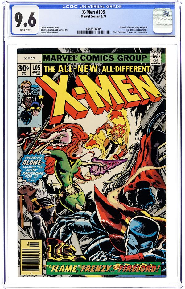 "Phoenix Unleashed!" Part 1 of 3. Guest-starring Firelord and Misty Knight. Story by Chris Claremont. Art by Dave Cockrum and Bob Layton. The sinister Eric the Red makes his move. Charles Xavier is stunned when he is finally confronted with the beauty from his visions. Plus, Phoenix must face the awesome power of Firelord, former Herald of Galactus! Story continues in Uncanny X-Men #107. NOTE: Lilandra's name is revealed for the 1st time. 36 pgs. Cover price $0.30. Grade: CGC 9.6 explanation of grade Condition: Used (collectible)