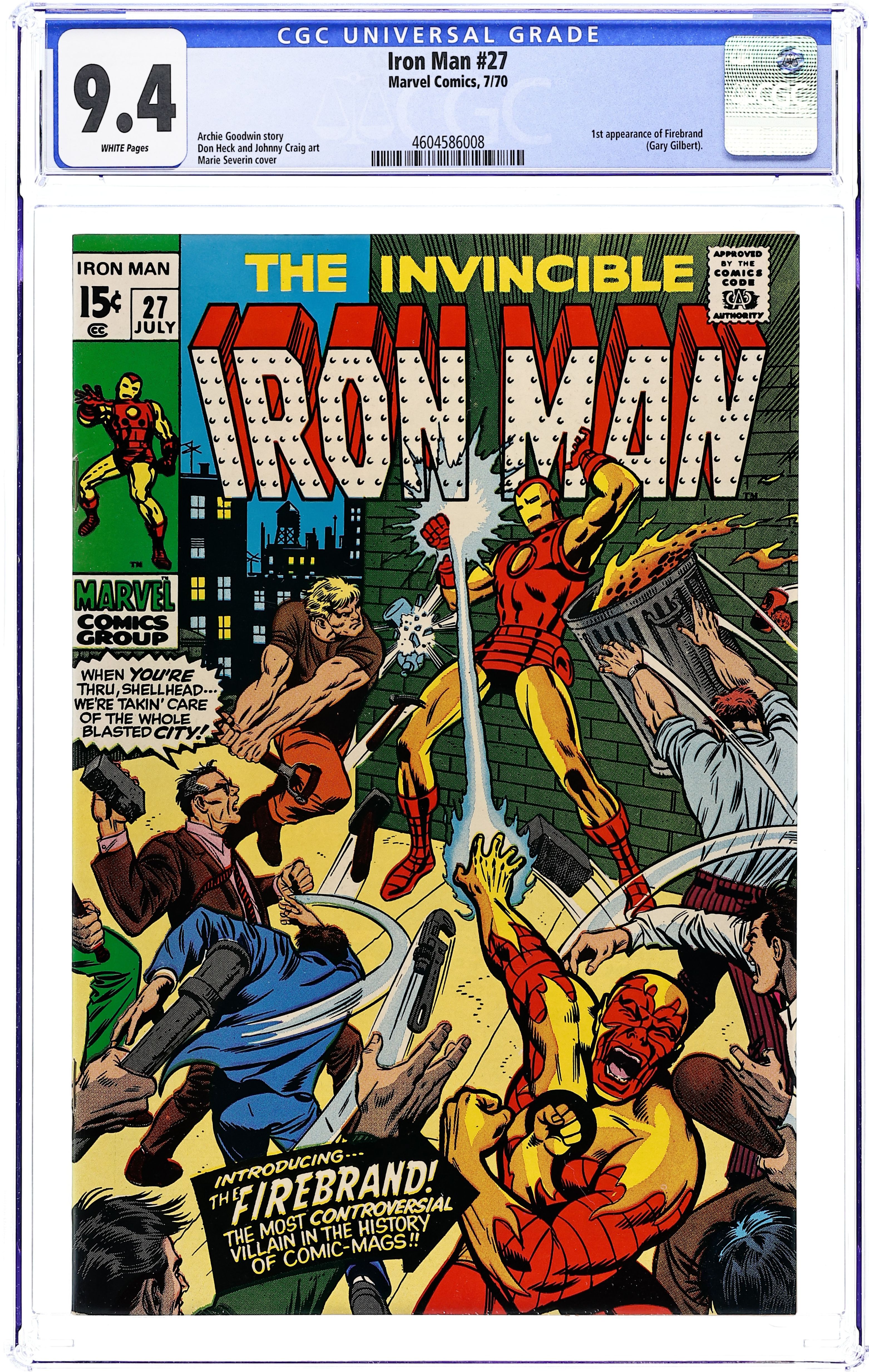 "The Fury of the Firebrand!" Story by Archie Goodwin. Art by Don Heck and Johnny Craig. Cover by Marie Severin and Joe Sinnott. Iron Man and Eddie March attend the ground-breaking ceremony of a new community center in Bay City. However, before the ceremony can begin; a super-powered anarchist stirs up trouble in the racially-divided community, and suddenly a full-scale riot erupts! Can Shell-head restore order to the city and defeat this new foe? First appearance of Firebrand. 32 pages Cover price $0.15. Grade: CGC 9.4 explanation of grade Condition: Used (collectible)