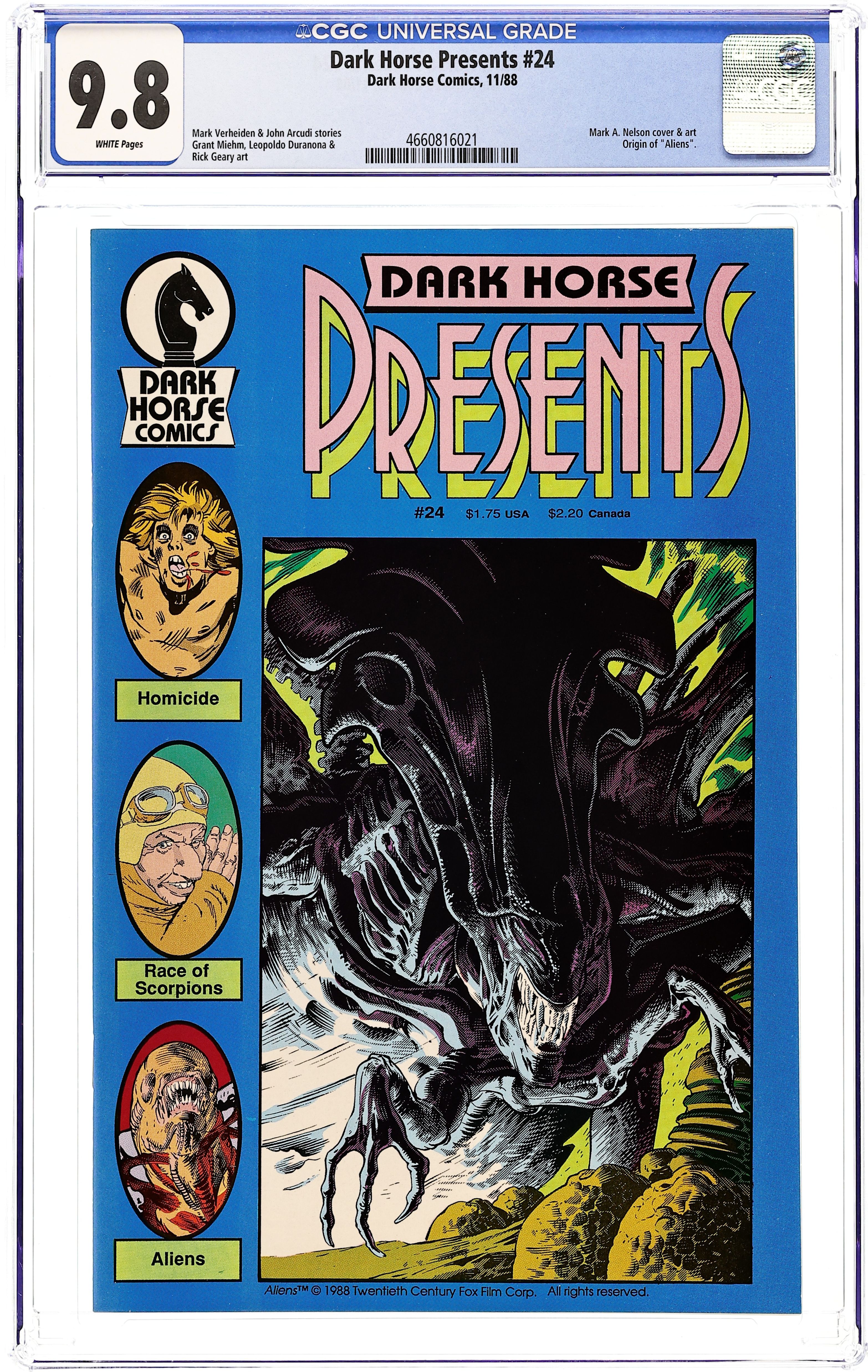 Cover by Mark A. Nelson. Writer Mark Verheiden and artist Mark A. Nelson present an all-new "side bar" story to Dark Horse's ongoing Aliens miniseries as they take us inside the mind of an Alien Queen! Plus-Just in time for Halloween, Kull writer John Arcudi and The American artist Grant Miehm team up on a tale of murder and...cannibalism in the wilds of New York. And Leopoldo Duranona continues his exciting five-part science fiction epic Race of Scorpions. 32 pages, B&W. Cover price $1.75. Grade: CGC 9.8 explanation of grade Condition: Used (collectible)