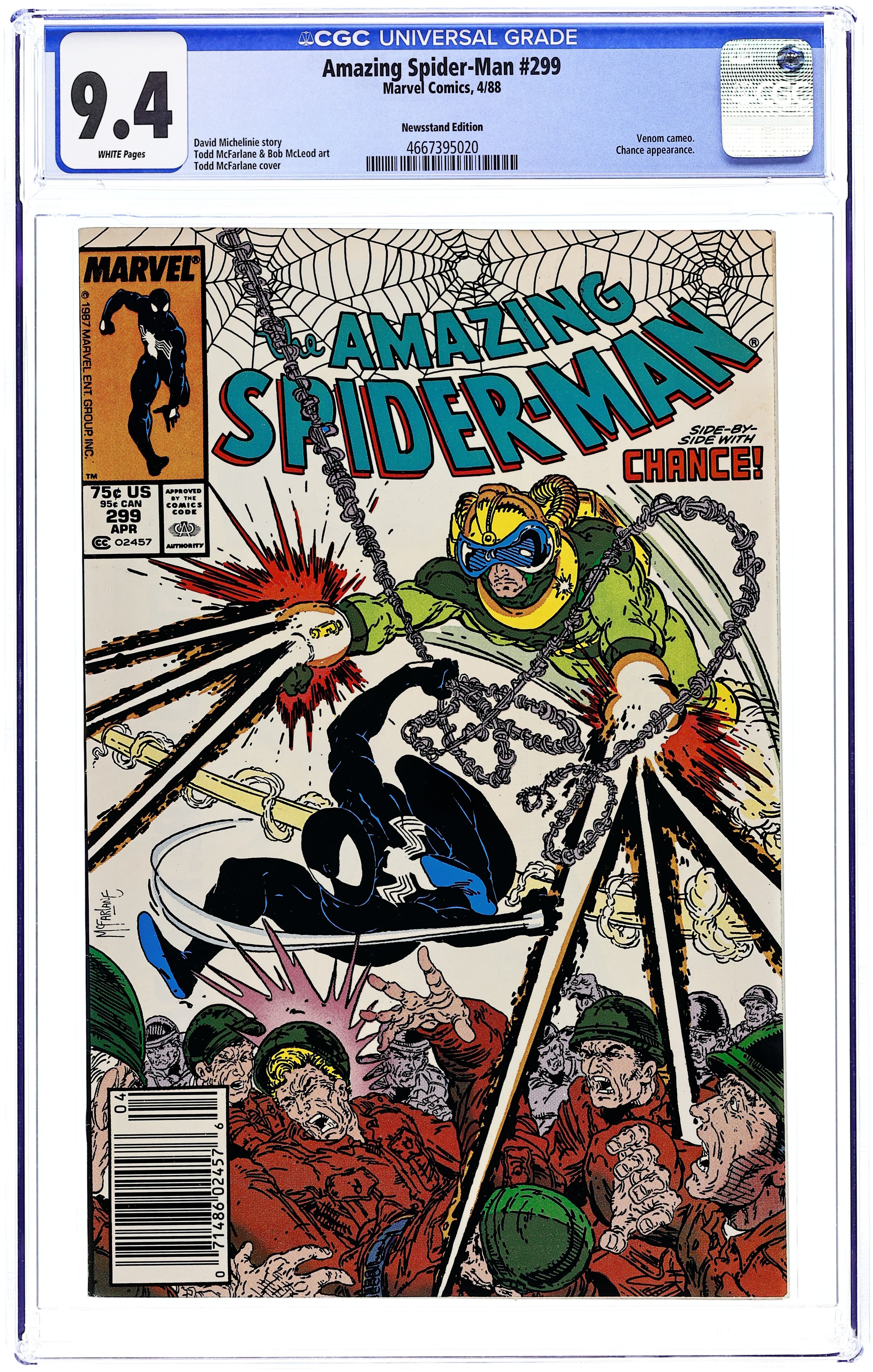 Newsstand Edition. "Survival of the Hittist!" Part 2 of 2. Script by David Michelinie. Pencils by Todd McFarlane. Inks by Bob McLeod. Cover by Todd McFarlane. After their waterfront arms theft goes awry, the Life Foundation turns the tables on Chance! The mysterious survivalist group abducts the mercenary and takes him to their secret headquarters in northern New Jersey! But thanks to a well-placed spider tracer, the web-slinger infiltrates the foundation's secluded colony the next day...and rescues Chance! So now the adversaries of 24 hours ago suddenly become allies to avoid death...courtesy of the Life Foundation! First appearance (and cameo on the last page) by Venom. Cameo appearances by Eddie Murphy, Paul Schaffer, and Joe Robertson. Last 75ยข issue. 36 pages, full color. (Note: Chance returns in Amazing Spider-Man 336.) Cover price $0.75. Grade: CGC 9.4 explanation of grade Condition: Used (collectible)