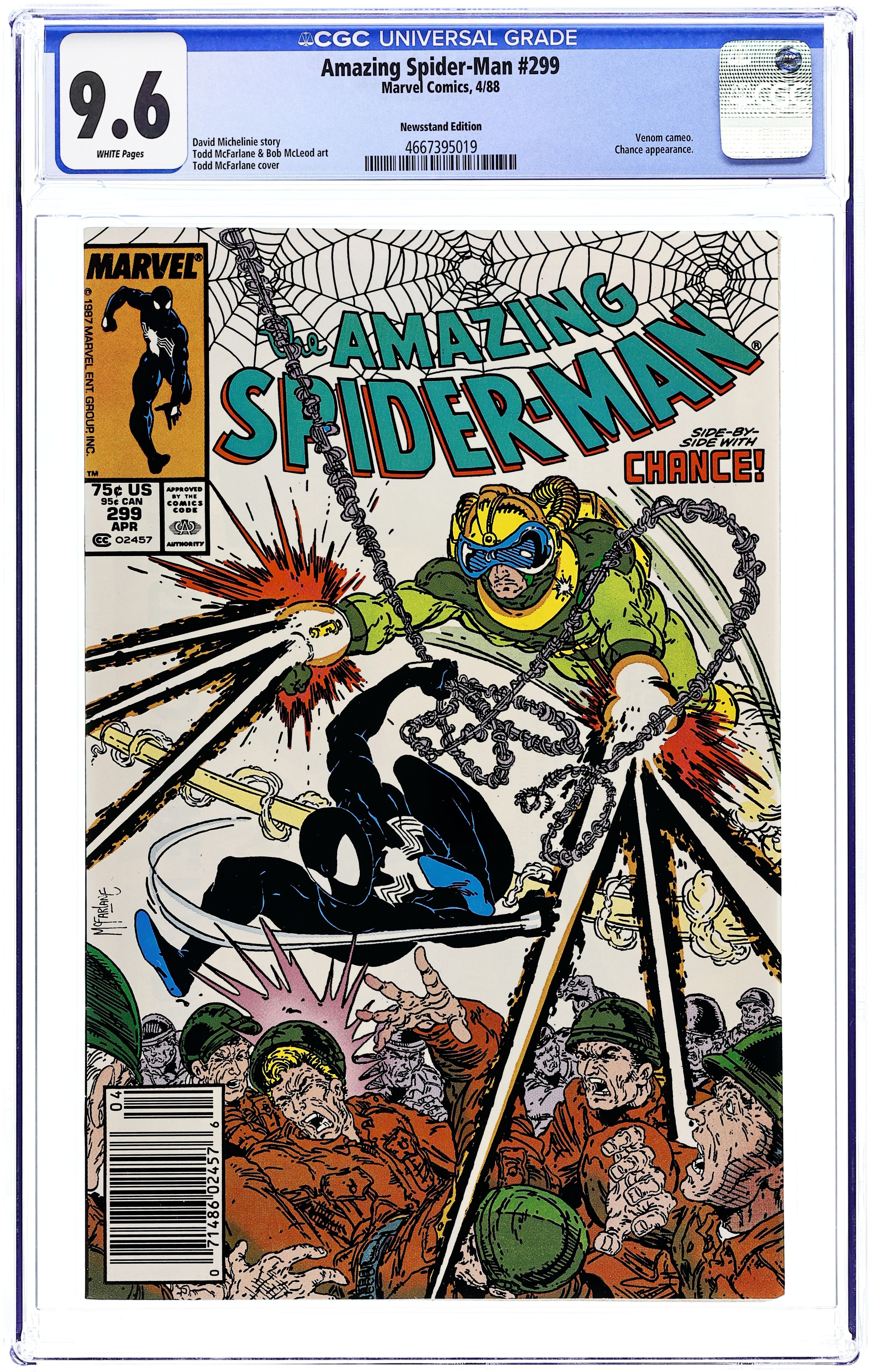 Newsstand Edition. "Survival of the Hittist!" Part 2 of 2. Script by David Michelinie. Pencils by Todd McFarlane. Inks by Bob McLeod. Cover by Todd McFarlane. After their waterfront arms theft goes awry, the Life Foundation turns the tables on Chance! The mysterious survivalist group abducts the mercenary and takes him to their secret headquarters in northern New Jersey! But thanks to a well-placed spider tracer, the web-slinger infiltrates the foundation's secluded colony the next day...and rescues Chance! So now the adversaries of 24 hours ago suddenly become allies to avoid death...courtesy of the Life Foundation! First appearance (and cameo on the last page) by Venom. Cameo appearances by Eddie Murphy, Paul Schaffer, and Joe Robertson. Last 75ยข issue. 36 pages, full color. (Note: Chance returns in Amazing Spider-Man 336.) Cover price $0.75. Grade: CGC 9.6 explanation of grade Condition: Used (collectible)