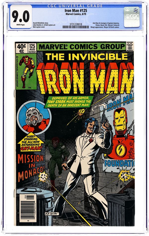 Newsstand Edition. "The Monaco Prelude" Part 3 of 5. Guest-starring Captain America and Ant-Man (aka Scott Lang). Plot by David Michelinie and Bob Layton. Script by David Michelinie. Art by John Romita Jr. (breakdowns) and Bob Layton (finishes). Cover by Bob Layton. In a shocking development, Iron Man killed the Carnelian ambassador with an inadvertent repulsor ray blast last issue. And now Tony Stark must hand over his armor to the police and figure out what to do next! With assistance from Ant-Man and the Sentinel of Liberty, Tony learns that a mysterious man in Monaco is responsible for the deadly malfunction of his armor! So the golden avenger (sans armor) and Rhodey fly to Monte Carlo to clear Iron Man's name! This won't be Tony's typical vacation on the French Riviera! Cameo appearances by the Beast, Falcon, Ms. Marvel, Vision, Wasp, Whiplash, Ed Koch, Bethany Cabe, and Justin Hammer. 32 pages. Cover price $0.40. Grade: CGC 9.0 explanation of grade Condition: Used (collectible)