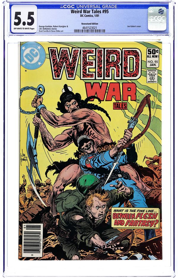 Starts Feb 9 Newsstand Edition. Cover art by Joe Kubert. Come Play War with Me!, script by George Kashdan, art by Fred Carrillo; set in 1853 in the Crimean Mountains during the Crimean War. The Way of the Horse, script by Dan Mishkin and Gary Cohn, art by Nestor Infante; set among native Americans in the American plains at an unknown time. The 600 Heads of Death!, script by Robert Kanigher, art by Steve Ditko; set hundreds of years ago on Easter Island. Between Flesh and Fantasy, script by J. M. DeMatteis, art by Noly Zamora; set during World War II. 36 pgs. $0.50. Cover price $0.50. Grade: CGC 5.5 explanation of grade Condition: Used (collectible)