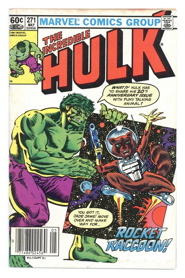 Starts Feb 2 Newsstand Edition. 2nd appearance of Rocket Raccoon (see Marvel Preview #7 for 1st appearance). Story by Bill Mantlo. Art by Sal Buscema. The Hulk celebrates his 20th Anniversary with one of the most offbeat stories of all. Following the events of last issue, Hulk hurtles through the void only to run into the marvelous Rocket Raccoon and his band of colorful friends. Can the Hulk aid Rocket and his crew against the machiavellian Judson Jakes and his sinister scientist, the tortoise Uncle Pyko? 36 pages. Cover price $0.60. Grade: VG 4.0 explanation of grade Condition: Used (collectible)