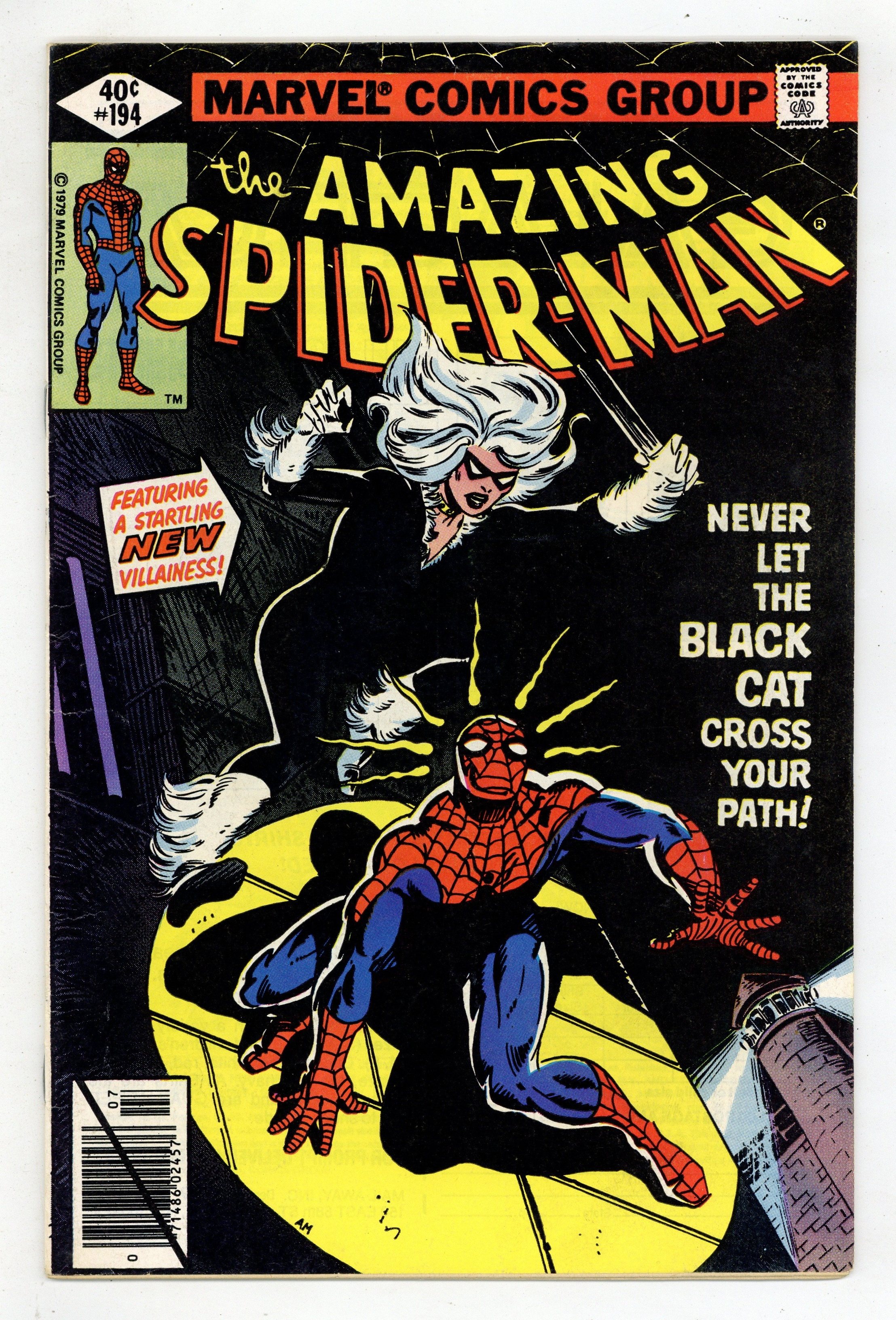 Direct Edition. First appearance of the Black Cat in "Never Let The Black Cat Cross Your Path!" Part 1 of 2. Script by Marv Wolfman. Art by Keith Pollard (breakdowns) and Frank Giacoia (finishes). Cover by Al Milgrom. One of the landmark issues of the Amazing Spider-Man series! The dazzling debut of the Black Cat! The wall-crawler has spent the first 193 issues of his title chasing super-villains! But tonight he's going to kiss one instead! Wow! Does the web-slinger stand a chance against the beauty and charm of Felicia Hardy? Not when the alluring cat has his tongue! And maybe later his heart! A terrific issue! Cameo appearances by Aunt May, Betty Brant, Ned Leeds, Harry Osborn, Flash Thompson, Mysterio (in civilian clothes), and the burglar. (Notes: The Black Cat is the creative highlight of the Wolfman-Pollard run on the Amazing Spider-Man title. Dave Cockrum designed the cat's costume. The letters page includes an alternate cover (for issue 194) by Keith Pollard. It also includes an alternate cover to Spider-Woman 9 by Carmine Infantino. This two-part story was reprinted in the trade paperback: Spider-Man vs. the Black Cat (2005). 36 pages, full color. Cover price $0.40. Grade: VG/FN 5.0 explanation of grade Condition: Used (collectible)