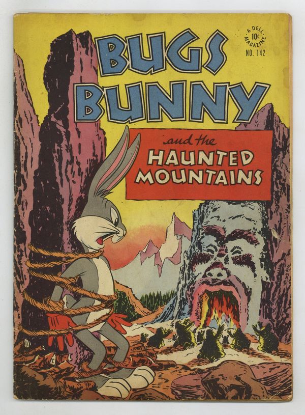Indicia title is "BUGS BUNNY AND THE HAUNTED MOUNTAINS, No. 142." Cover art by Tom McKimson. Bugs Bunny and the Haunted Mountains, art by Tom McKimson; Bugs goes to the mountains to escape the excitement of city life, but finds that the country has its own share of excitement. Road to Riches, art by Tom McKimson; Bugs must find a way to repay his $20 debt while being hounded by a collector from The-Forget-To-Pay-And-Regret-The-Day Debt Collection Company. Bugs Bunny, the Fearless, art by Roger Armstrong; Bugs must find something he's afraid of to prove he's normal, and suitable to inherit $500,000 from his Uncle Jack Rabbit. Bugs Bunny and Man-O-Battle, art by Don Gunn; Bugs must ride Man-O-Battle to victory to win over Colonel Bunny, the father of Magnolia Bunny. 52 pages, full color. Cover price $0.10. Grade: GD+ 2.5 explanation of grade Condition: Used (collectible)