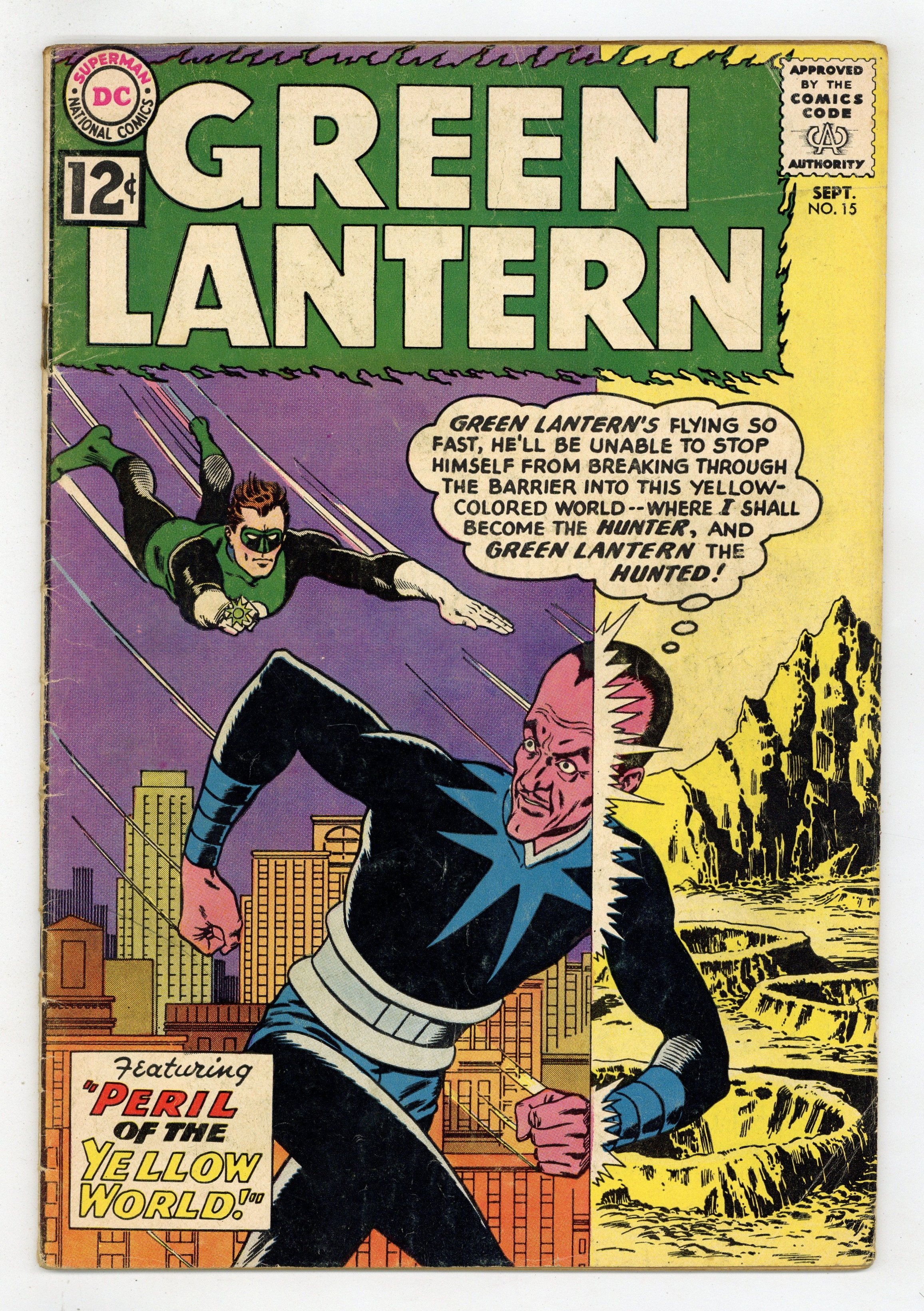Cover pencils by Gil Kane, inks by Murphy Anderson. Peril of the Yellow World!, script by John Broome, pencils by Gil Kane, inks by Joe Giella; In an attempt to win the title of Most Evil Citizen of Qward, Sinestro traps Green Lantern on a world where everything is yellow. Zero Hour in Rocket City!, script by John Broome, pencils by Gil Kane, inks by Joe Giella; When Hal Jordan learns about the "Rocket Robbers" who are planning their robberies around the launch of rockets from Rocket City he tries to stop the crooks, even though his power ring is almost out of its charge. 36 pgs. $0.12. Cover price $0.12. Grade: GD/VG 3.0 explanation of grade Condition: Used (collectible)