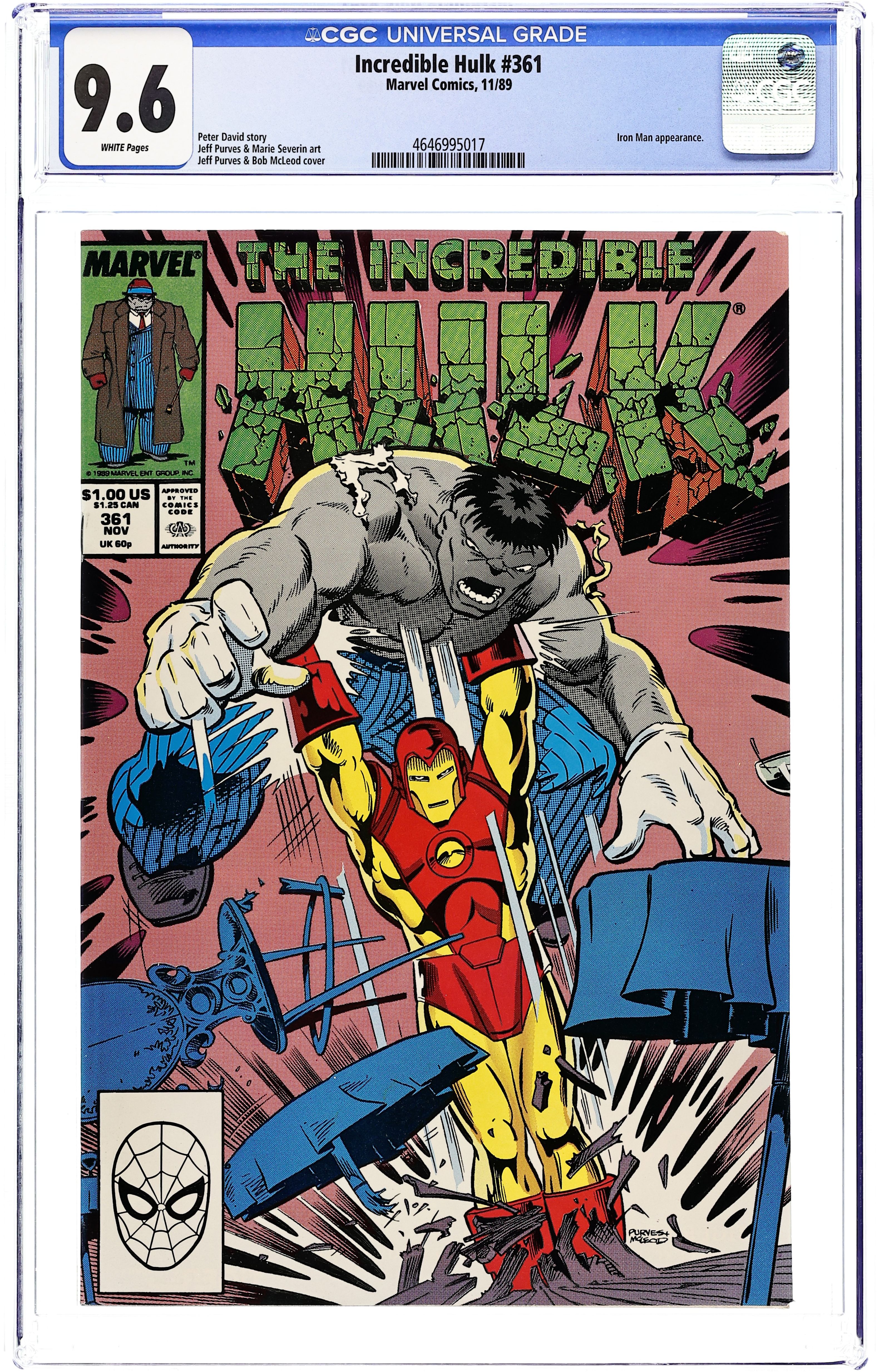 Starts Jan 19 "Iron Tears" Part 4 of 4. Guest-starring Iron Man. Script by Peter David. Pencils by Jeff Purves. Inks by Marie Severin. Cover by Jeff Purves and Bob McLeod. Story continues from Iron Man 247. Shell-Head and the Gray Goliath work together to deceive the Maggia! Iron Man wants to capture Madame Masque; and the Hulk wants to get paid for his trip to Los Angeles! But the powerful duo better be careful! Because A.I.M., Hydra, and the Maggia play for keeps! In the meantime, Tony Stark learns that Betty Banner has miscarried Bruce's baby, but he decides not to tell his friend. Cameo appearance by Mrs. Arbogast. 36 pages. Cover price $1.00. Grade: CGC 9.6 explanation of grade Condition: Used (collectible)