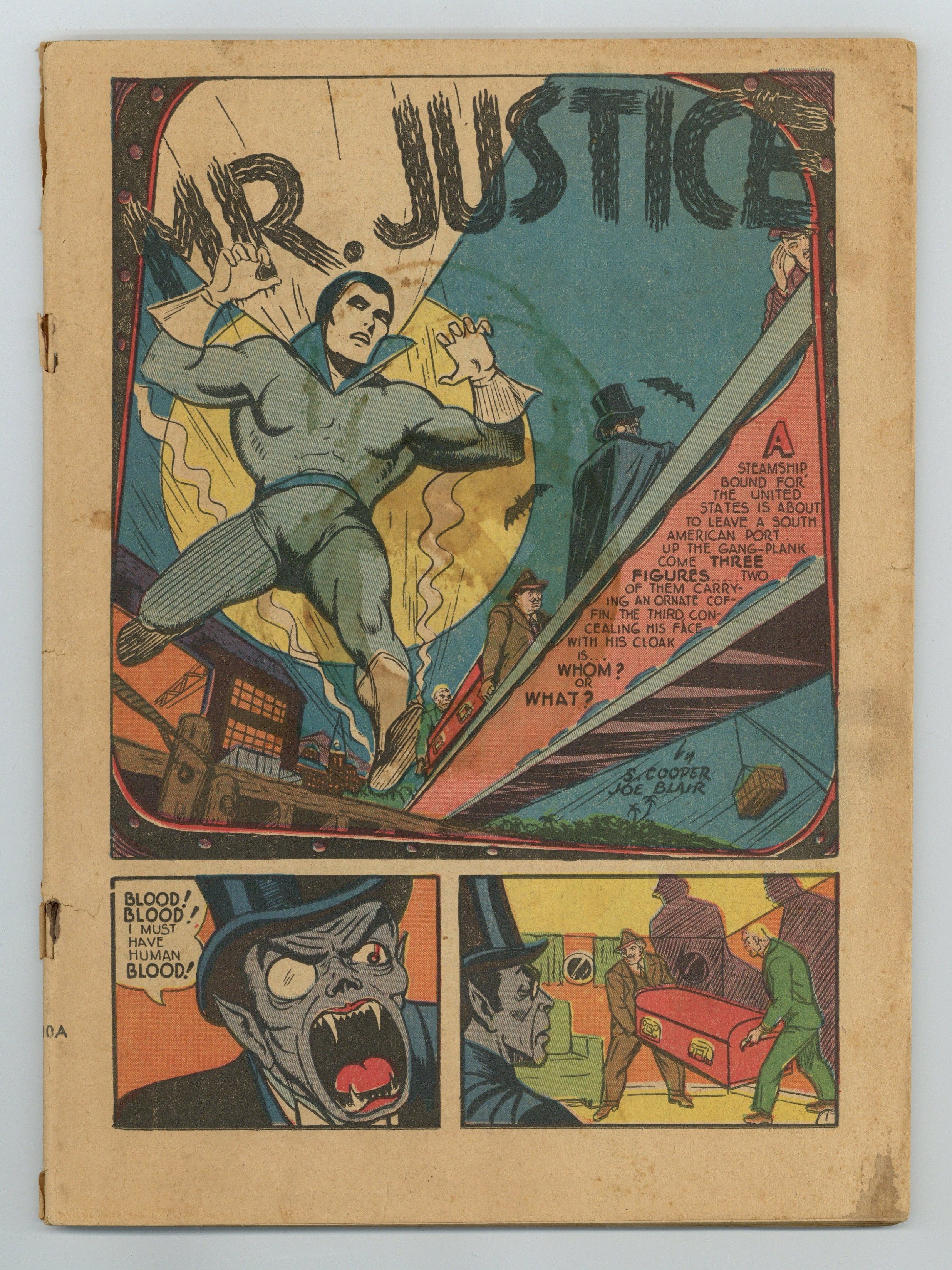 Cover art by Sam Cooper. Waltz of the Vampire starring Mr. Justice, script by Joe Blair, art by Sam Cooper; a vampire in the power of Nazi spies arrives from South America. Murder By Animals starring the dog Rang-A-Tang, script by Joe Blair, art by Ed Smalle. The Murder of Marion Harper starring Fox, script by Joe Blair, art by Irwin Hasen. The Flying Fortress Mystery: Part 1 starring Steve Stacey, script by H. A. Biern, art by Nick Zuraw. The Execution of Slapsie starring Corporal Collins, art by Charles Biro. The Track Meet starring Ty-Gor, script by Joe Blair, art by Mort Meskin. Prisoner of the Barbarians starring Doc Strong, script by Joe Blair, art by George Mandel. Infiltrating the Italians starring Loop Logan, script by Joe Blair, art by Frank Volp. Allied Against Spain starring Green Falcon, script by Harry Shorten, art by Roland "Ramona" Patenaude. 68 pgs. $0.10. Cover price $0.10. Grade: Coverless explanation of grade Condition: Used (collectible)