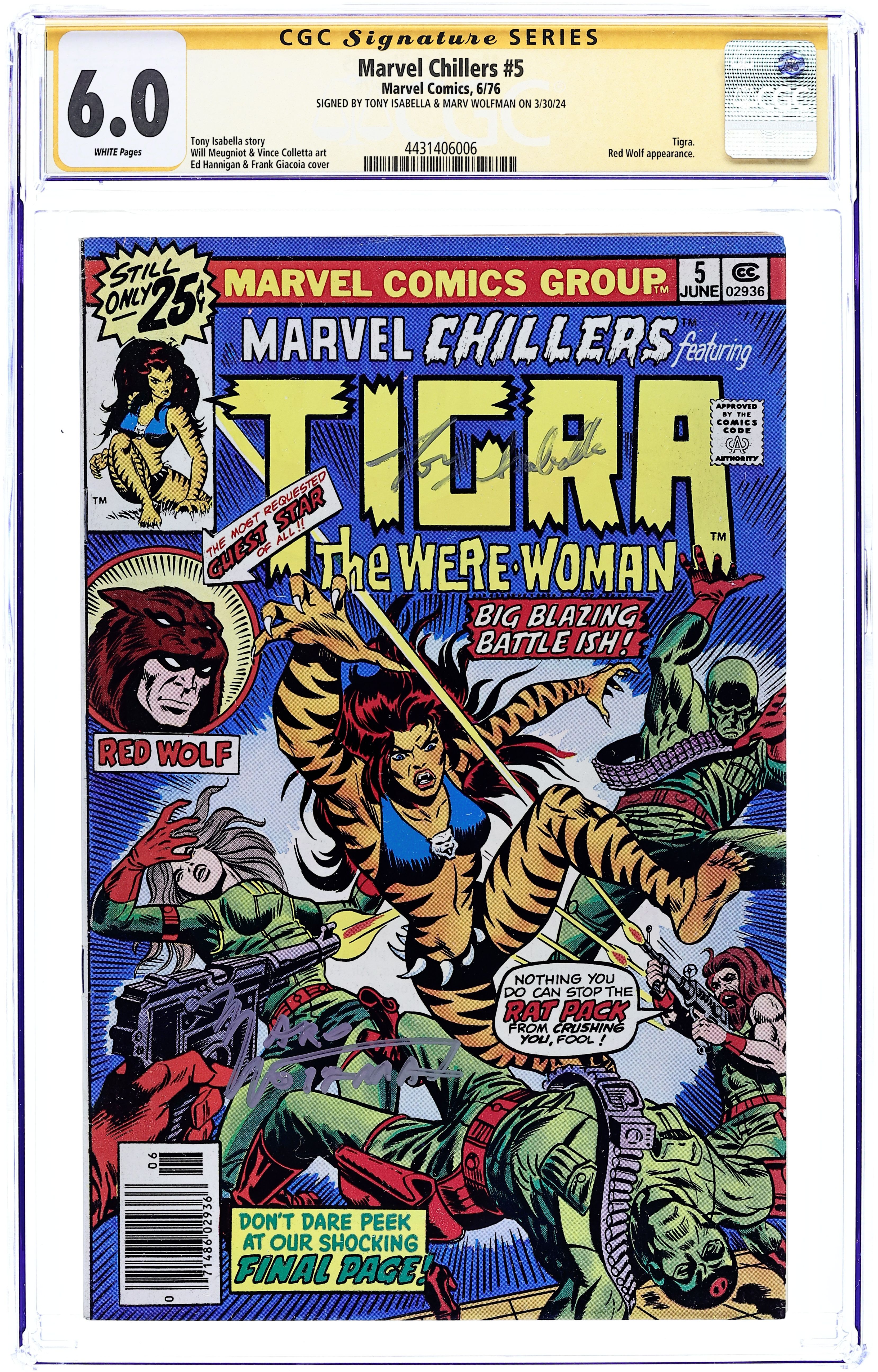 Starts Mar 9 25 cent edition. Cat and Mouse - Written by Tony Isabella. Art by Will Meugniot and Vince Colletta. Cover inks by Frank Giacoia. Big blazing battle issue! Featuring the most requested guest star of all -- Red Wolf! Can Tigra do anything to stop Joshua Plague and the Rat Pack from crushing her? Don't dare peek at the shocking final page! 32 pages, full color. Cover price $0.25. Grade: CGC 6.0 explanation of grade Condition: Used (collectible)