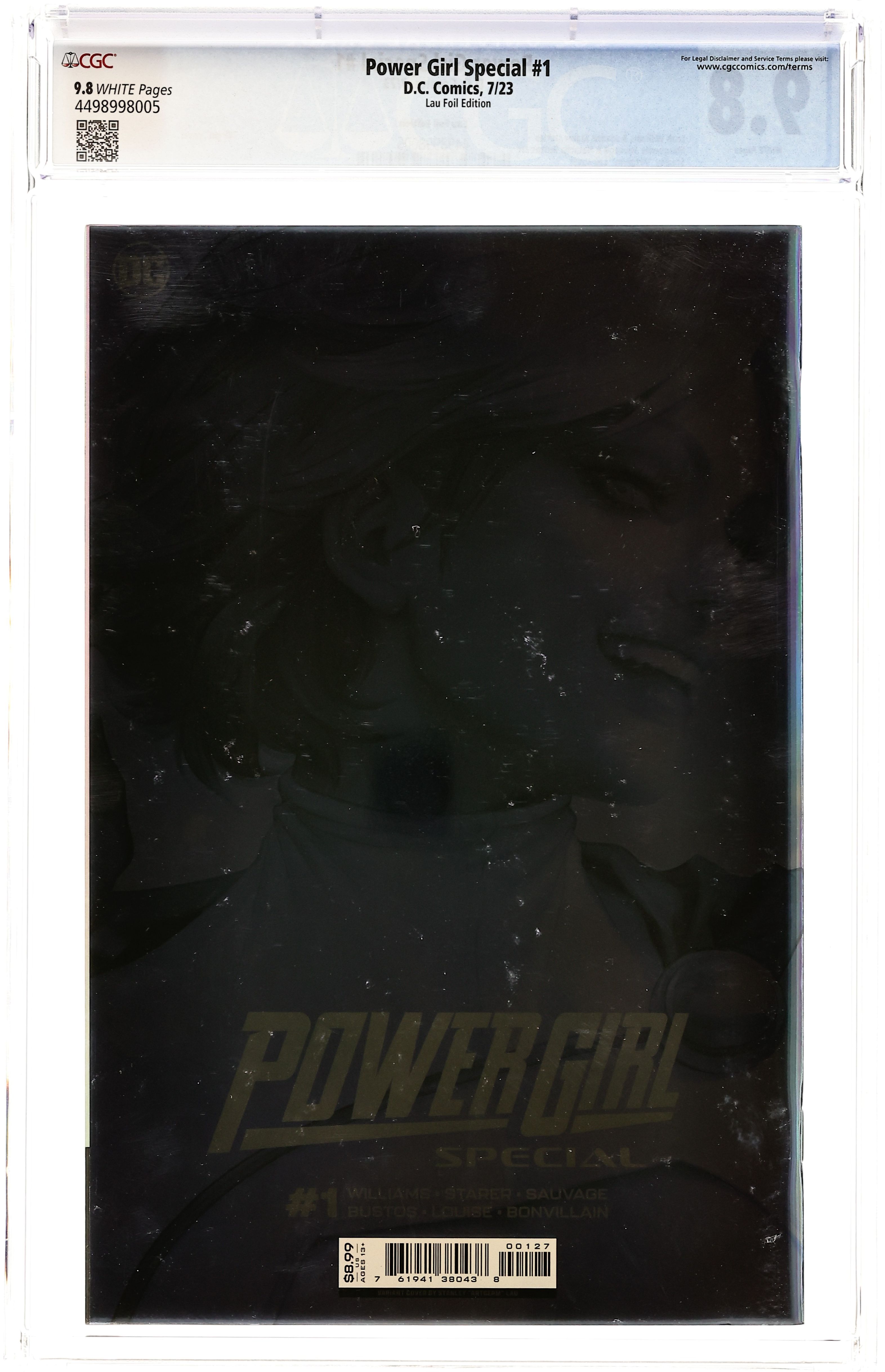 Written by Leah Williams; Joanne Starer. Art by Marguerite Sauvage; Natacha Bustos. Cover by Stanley Artgerm Lau. POWER GIRL TAKES CENTER STAGE! With new powers and a new mission, Power Girl faces a challenge unlike any she's experienced before in this shocking one-shot rising from the events of Lazarus Planet and Action Comics! With Omen's guidance, Power Girl now strives to battle the demons—literal and figurative—lurking within the minds of some of the greatest superheroes in the DC Universe! But the nefarious Johnny Sorrow has been searching for a connection to Earth-0, and the superheroines' work may unwittingly give him the means to make their world his personal stage! Can Power Girl and her estranged Super-Family bring down the curtain on Sorrow's evil plans? And at what cost? 48 pages, full color. Rated T+ Cover price $8.99. Grade: CGC 9.8 explanation of grade Condition: Used (collectible)