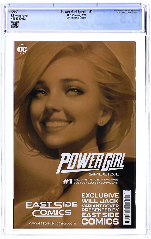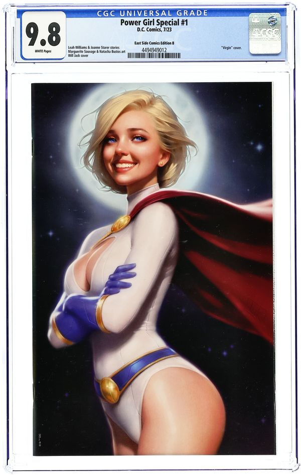 East Side Comics Exclusive Smiling Virgin Cover by Will Jack. Written by Leah Williams; Joanne Starer. Art by Marguerite Sauvage; Natacha Bustos. POWER GIRL TAKES CENTER STAGE! With new powers and a new mission, Power Girl faces a challenge unlike any she's experienced before in this shocking one-shot rising from the events of Lazarus Planet and Action Comics! With Omen's guidance, Power Girl now strives to battle the demons—literal and figurative—lurking within the minds of some of the greatest superheroes in the DC Universe! But the nefarious Johnny Sorrow has been searching for a connection to Earth-0, and the superheroines' work may unwittingly give him the means to make their world his personal stage! Can Power Girl and her estranged Super-Family bring down the curtain on Sorrow's evil plans? And at what cost? 48 pages, full color. Rated T+ Cover price $6.99. Grade: CGC 9.8 explanation of grade Condition: Used (collectible)