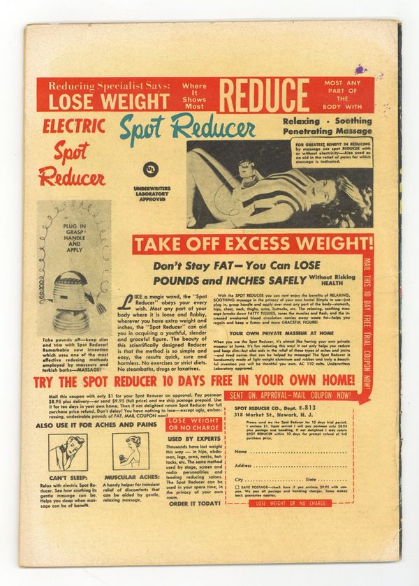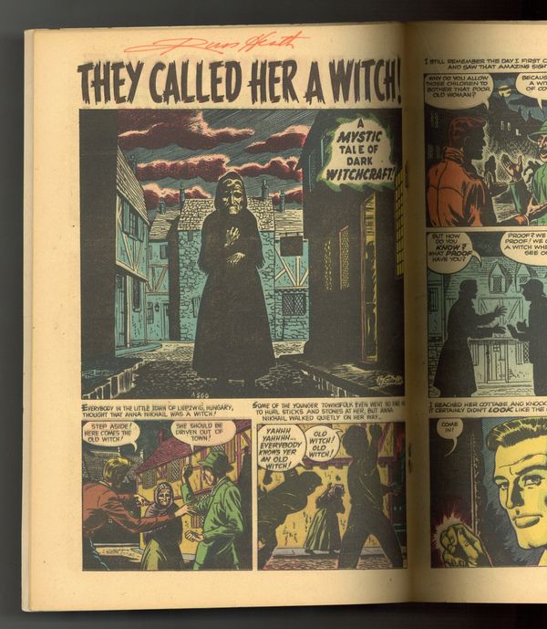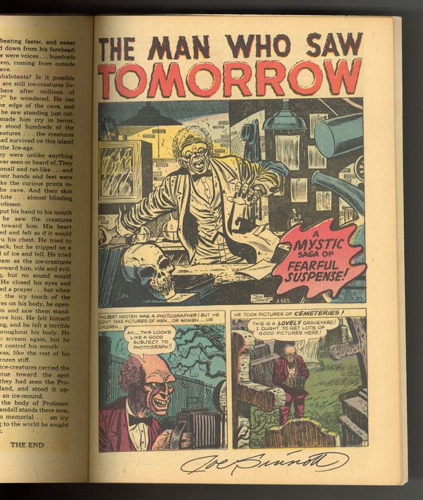 Starts Apr 4 Cover art by Russ Heath. Bluebeard, art by Tony Di Preta; A man who calls himself Bluebeard murders and robs the guests of his inn, but when a thief carrying a bottle of Nitro becomes his latest victim, Bluebeard decides to dispose of the bottle outside. Death Notice!; An obit writer who finds that he has the power to cause the deaths he writes about has the tables turned on him when the ghosts of his victims print an edition of the paper that says he dies in a train wreck. They Called Her a Witch!, script by Stan Lee, art by Russ Heath; Peasants call an old woman a witch, a man gives her the benefit of the doubt, but it turns out the peasants were right. Doom Island text story. The Man Who Saw Tomorrow, art by Joe Sinnott; A man who invents a camera that can photograph the future is terrified when he sets it to a week in advance and produces a...blank photo. Detour!, art by Myron Fass; A man at a train crossing is killed and places a curse on motorists every year that one person must take his place. 36 pgs. $0.10. Cover price $0.10. Grade: VG- 3.5 explanation of grade Condition: Used (collectible)