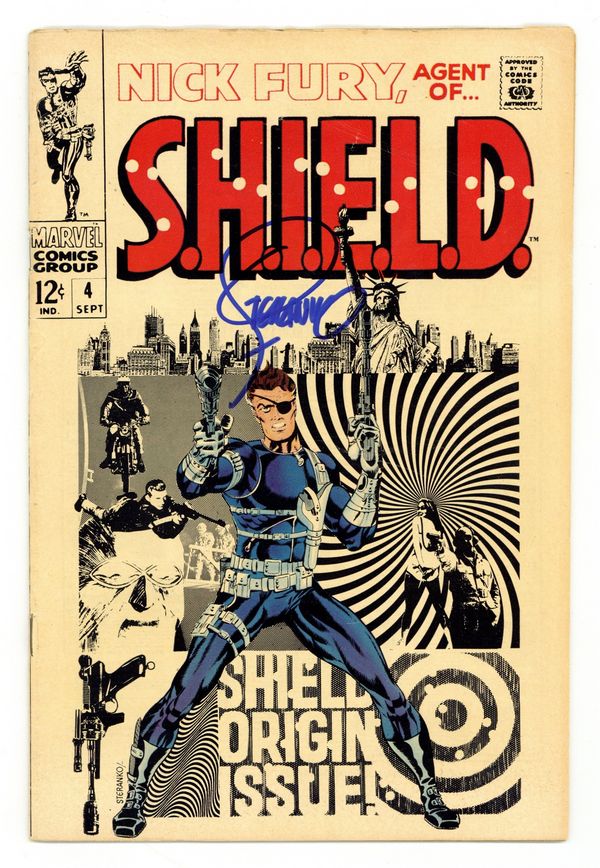 Starts Feb 16 Cover by Jim Steranko. SHIELD origin retold in "And Now It Begins...', script by Roy Thomas (plot, dialogue) and Frank Springer (plot), art by Frank Springer; HYDRA repeatedly tries to murder Nick Fury before he can recruited to head SHIELD; The agent in charge of the operation, Agent L, is executed for his failure by Agent H; After reminiscing about his days in WW2, Fury meets Tony Stark, who introduces him to the SHIELD board of directors, then shows him a film detailing HYDRA's operations; After Fury uncovers a bomb in the room and dispatches it, along with the spy who planted it, he realizes the danger facing the free world and takes the job. Frank Springer's 1st Marvel work. 36 pgs., full color. $0.12. Cover price $0.12. Grade: VG+ 4.5 explanation of grade Condition: Used (collectible)