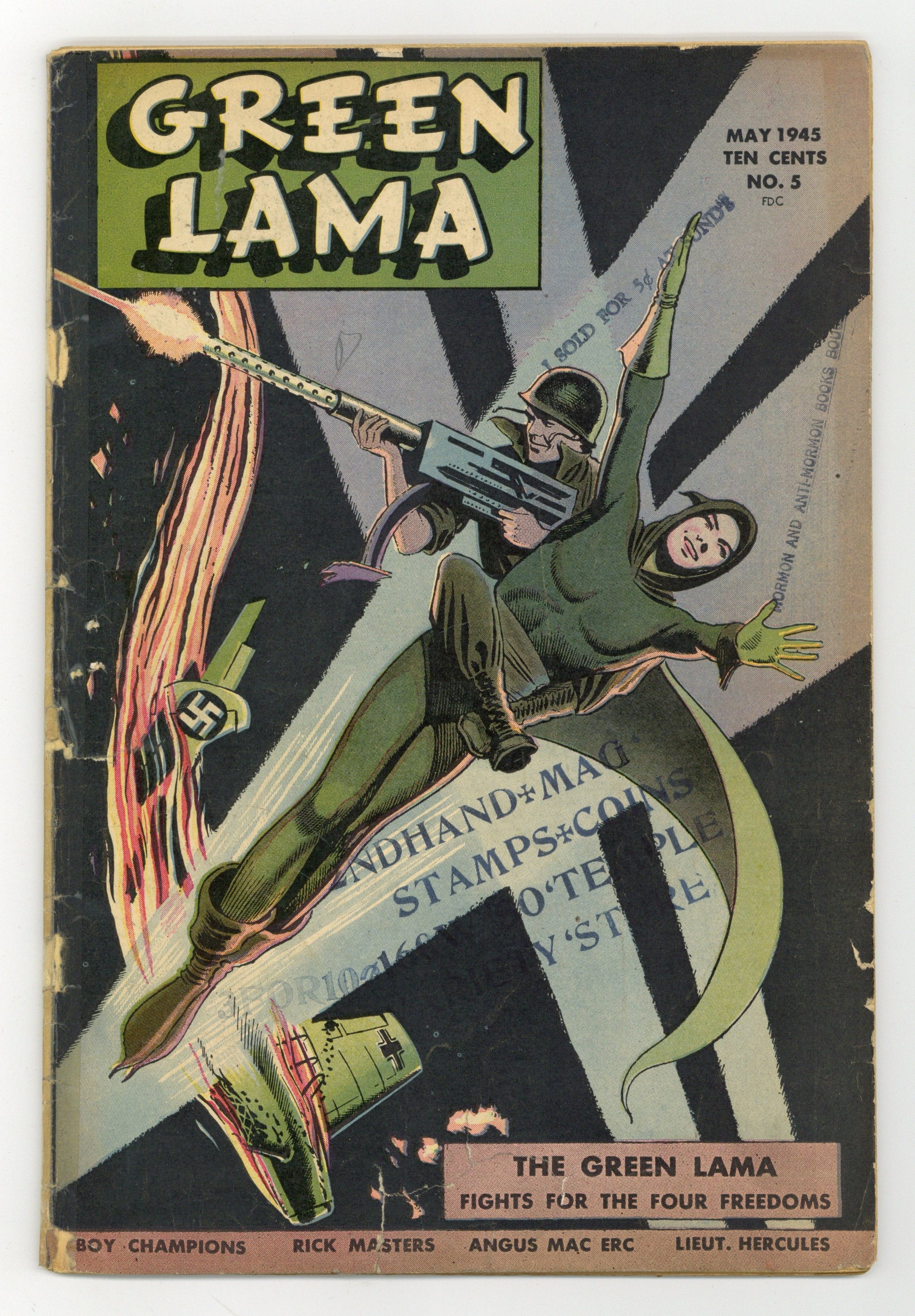 Ends Feb 16 8:29 PM CST Bid History 6 bids Current Bid $48 Your Secret Max Bid If you'd like to bid, please log in or register. Edited by Joseph Greene. Cover by Mac Raboy. Written by Ken Crossen (as Richard Foster). Art by Mac Raboy and Harry Anderson. The Four Freedoms!; A letter from a Private in the Army brings the Green Lama to an Army camp, wherein resides a resident bigot. Written by Joseph Greene (as Joseph Verdy). Art by Jerry Robinson. Tuffy Becomes a Papa!; "Ace" Ryan sends out one of his aides to case a store for a robbery, and then discovers that an Easter display for children may interfere with those plans. Written by Horace L. Gold. Art by Irving Tirman (as Ira Turner). Little Coughin' Fannie!; Still in comic land, Lt. Hercules helps put an end to a smuggling operation. Written by Bruce Elliott (as Walter Gardner). Art by Mort Lawrence. A Twist of Time!; Rick and Mike find themselves 100,000 years in the past after being hired to fly "blind" to San Francisco using only a televisor invention. Written by Bruce Elliott. Art by George Roussos (as Perry Williams). Sauce for the Sorcerer!; Angus decides that his peculiar talents are better suited in Great Britain than in the United States, so he boards a ship for Europe, not realizing he will battle head to head with another sorcerer. Ad encouraging readers to join the Green Lama Club, art by Mac Raboy. 52 pages, full color. $0.10. Cover price $0.10. Grade: PR 0.5 explanation of grade Condition: Used (collectible)