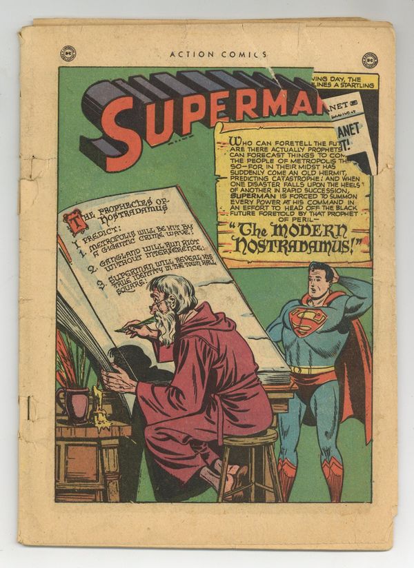 Cover art by Wayne Boring and Stan Kaye. The Modern Nostradamus starring Superman and Lex Luthor, art by Al Plastino. Man Against Manhunter starring Congo Bill, art by Ed Smalle. The Phoney Pitchman starring Zatara, art by W. F. White. Captain Tootsie ad, art by C. C. Beck. The Reluctant Annie Oakley starring Vigilante, pencils by Jerry Robinson, inks by Mort Meskin. 52 Pages, Full Color. $.10 Cover price $0.10. Grade: Coverless explanation of grade Condition: Used (collectible)