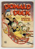 Indicia title is "DONALD DUCK IN FROZEN GOLD, No. 62." Cover art by Carl Buettner. Frozen Gold, script and art by Carl Barks; Donald flies penicillin to Point Marrow, Alaska, but a crook has stashed a stolen map to a gold mine in Donald's plane; When he reaches Alaska, Donald is kidnapped by two crooks and abandoned on the barrens. Mystery of the Swamp, script and art by Carl Barks; Donald and the nephews go exploring in the Everglades, where they run afoul of strange little goblins called Gneezles; Donald tries to capture a Gneezle, but instead the ducks are captured by them, and are to be fed to the alligators. Two untitled Donald Duck stories, art by Al Taliaferro. 52 pages, full color. Cover price $0.10. Grade: GD+ 2.5 explanation of grade Condition: Used (collectible)
