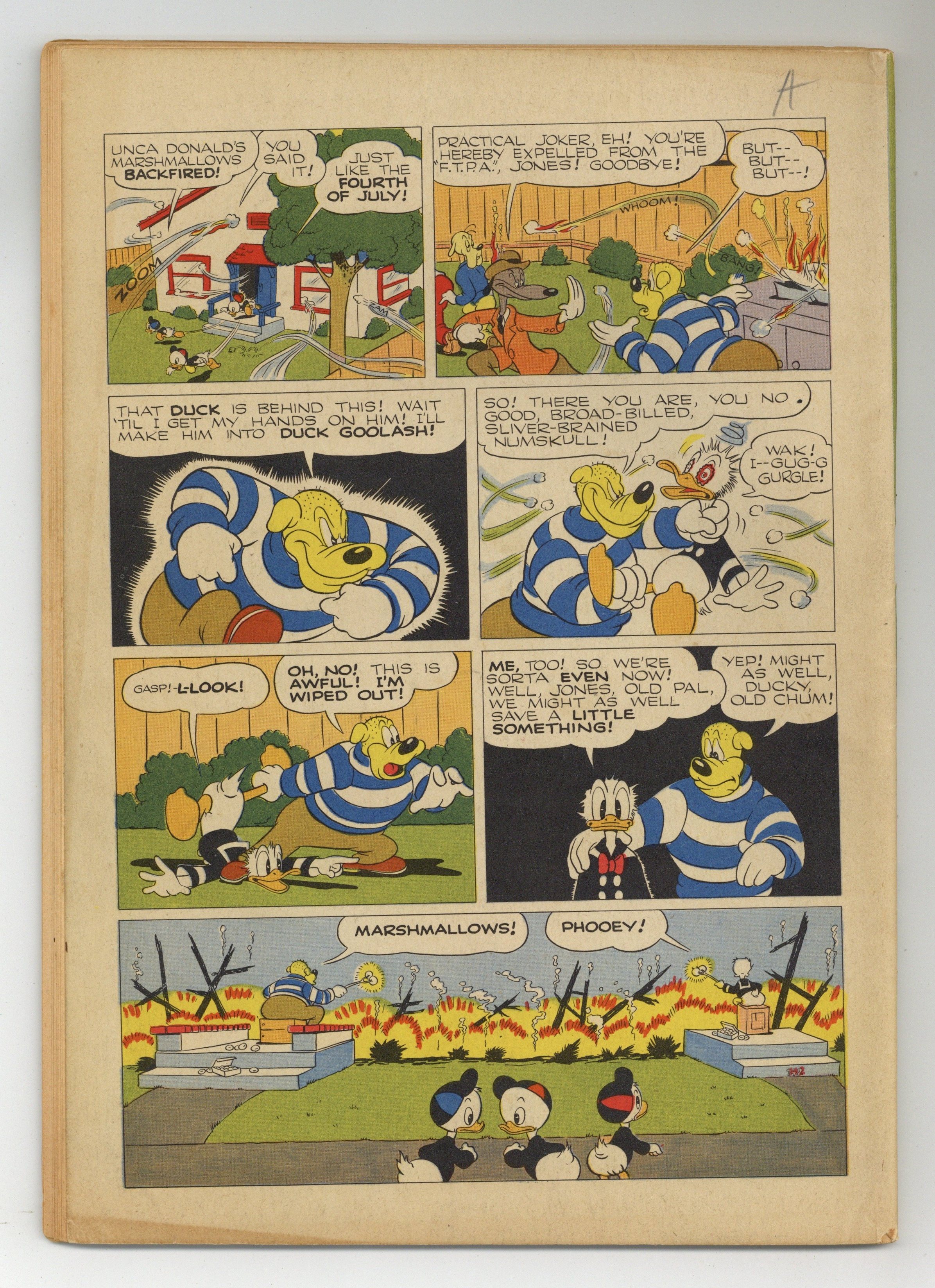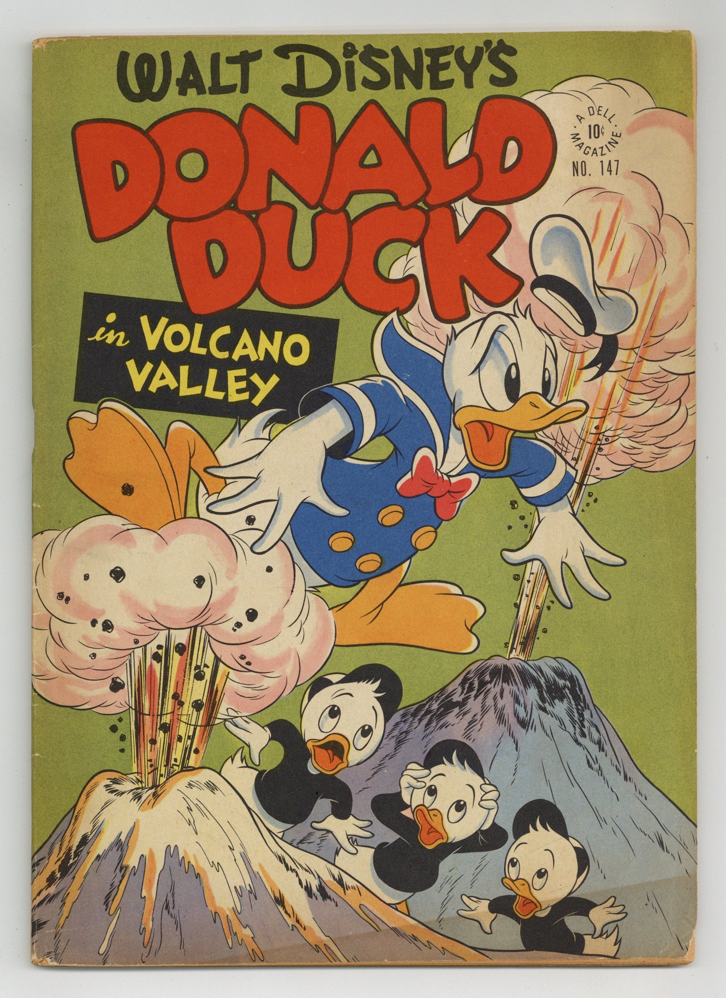 Indicia title is "WALT DISNEY"S DONALD DUCK IN VOLCANO VALLEY, No. 147." Cover art by Carl Buettner. Volcano Valley, script and art by Carl Barks; Donald accidentally receives a full-size World War II bomber instead of the model plane he ordered, and sells it to the South American country of Volcanovia. Donald Duck and Radio Trouble, art by Tom McKimson; Donald sends the nephews to buy six eggs, but the advertisement for the eggs lands upside-down and the kids buy him six expensive radios from the Friendly Credit Store instead. Donald Duck's Big Blow-out, art by Jack Hannah; Donald and Neighbor Jones both build barbecues and get in a fight when Jones buys up all the marshmallows in town for a party. 52 pages, full color. Cover price $0.10. Grade: VG- 3.5 explanation of grade Condition: Used (collectible)