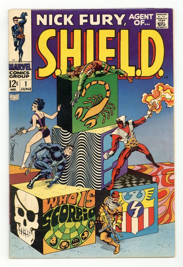Starts Feb 16 Cover by Jim Steranko. First appearance of Scorpio in "Who Is Scorpio?", script by Jim Steranko, pencils by Jim Steranko, inks by Joe Sinnott; Fury sneaks into an island fortress, only to get shot in the back. Surprise!; It's an L.M.D., and the shooter is the real Fury!; But on examination, Dugan informs Fury the L.M.D.'s been shot 4 times, not 3 - which means, someone tried to assassinate him!; The only clue is a tiny badge with a "Scorpio" symbol on it; In San Francisco, comic Flip Mason's on the run from gambling debts; In Kansas City, racketeer Mitch Hackett looks forward to joining the mob. In NYC, Fury & Val walk in the rain; At the Monza Autodrome, Count Julio Scarlotti wins a race - and we see he has a Scorpio tattoo on his wrist; Days later in Nevada, Fury helps test an "EPB G-System" (Entrope Phase Barrier Guard System), a force field which is hoped may one day protect entire armies. As SHIELD prepares one final test (with an H-Bomb!) we see the tech firing the missile has a Scorpio tattoo on his wrist; Fury suddenly realizes the EPB's down, and nobody answers his comm; He races across the desert to a rocket sled used by NASA to escape as the missile descends on the spot he was relaxing; At the U.S. Government Research Center in Las Vegas, everyone's been put to sleep with gas by Scorpio - when Fury arrives via motorcycle. Letter to the editor from comics writer Don McGregor. Cover price $0.12. Grade: VG+ 4.5 explanation of grade Condition: Used (collectible)