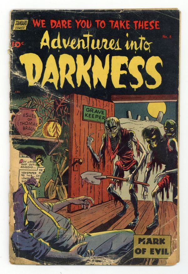 Contains Alex Toth art. In order of appearance: "Mark of Evil" art by Rocco "Rocke" Mastroserio; "Creepy Crossword Puzzle" activity page; "Death's Bridal Gown"; "The House That Jackdaw Built" art by Alex Toth, reprinted in Setting the Standard: Comics by Alex Toth 1952-1954 HC (2011 FB) #1-1ST; "The Fatal Strands"; and "The Twisted Hands" art by Alex Toth, reprinted in Setting the Standard: Comics by Alex Toth 1952-1954 HC (2011 FB) #1-1ST. "The Beast Wasn't Hungry: Stolen Diamonds Bring a Strange Reward in the Wilds of Africa!" illustrated text story by R. S. Fenton. 36 pages. Full color. Cover price $0.10. Grade: PR 0.5 explanation of grade Condition: Used (collectible)