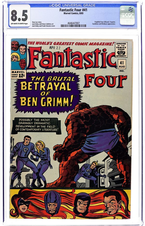 Cover pencils by Jack Kirby, inks by Frank Giacoia. The Brutal Betrayal of Ben Grimm!, script by Stan Lee, pencils by Jack Kirby, inks by Vince Colletta; The Frightful Four kidnap the Thing and brainwash him into aiding them against the rest of the FF. 36 pgs. $0.12. Cover price $0.12. Grade: CGC 8.5 explanation of grade Condition: Used (collectible)