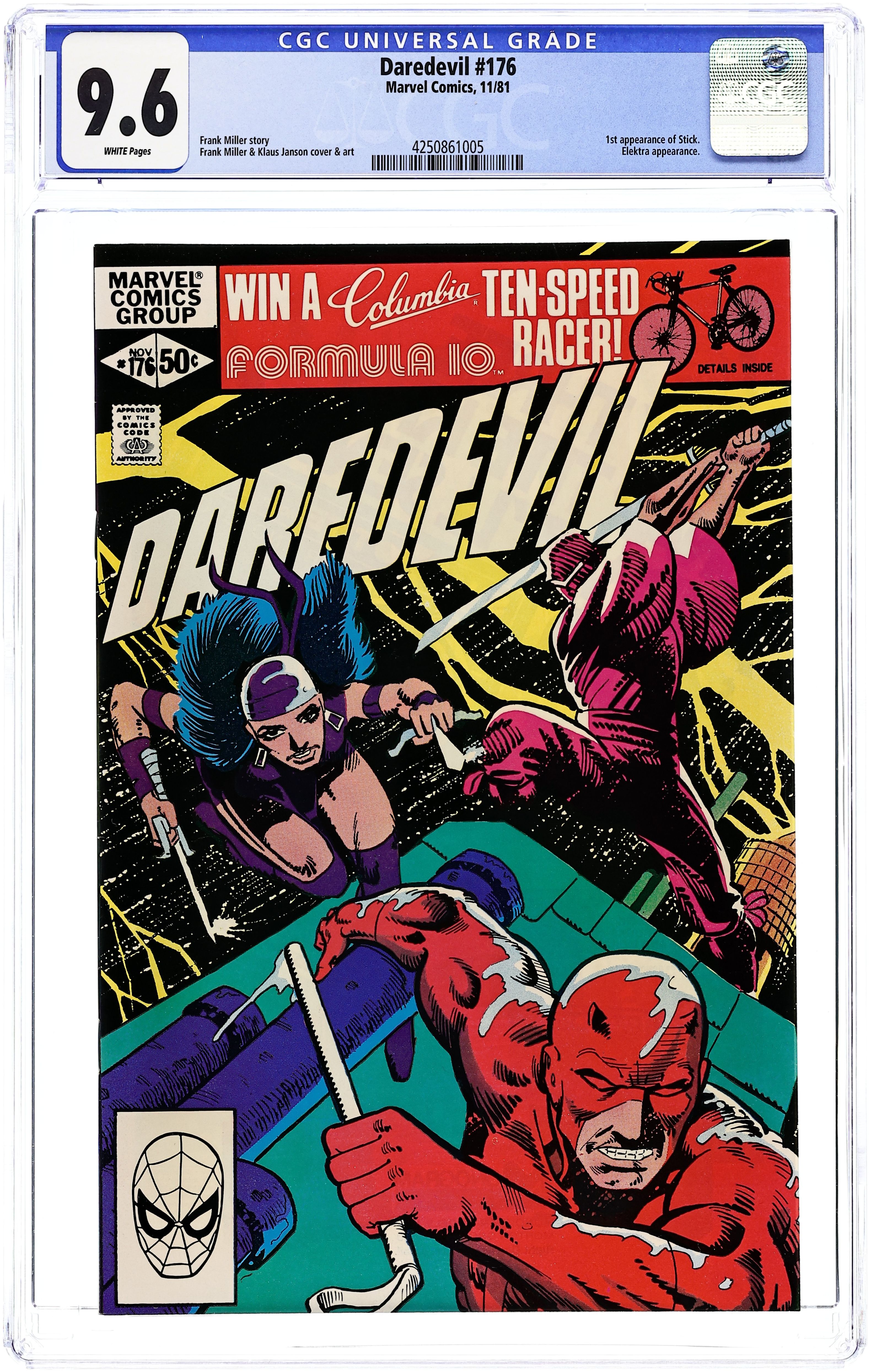 Direct Edition. Cover pencils by Frank Miller, inks by Frank Miller and Klaus Janson. First appearance of Stick in Hunters, script by Frank Miller, pencils by Frank Miller (breakdowns) and Klaus Janson (finished art), inks by Klaus Janson; DD and Elektra hunt down Matt's old teacher Stick; Turk steals the Mauler uniform to try and take down DD; Elektra has a final confrontation with Kirigi. 32 pgs. Cover price $0.50. Cover price $0.50. Grade: CGC 9.6 explanation of grade Condition: Used (collectible)