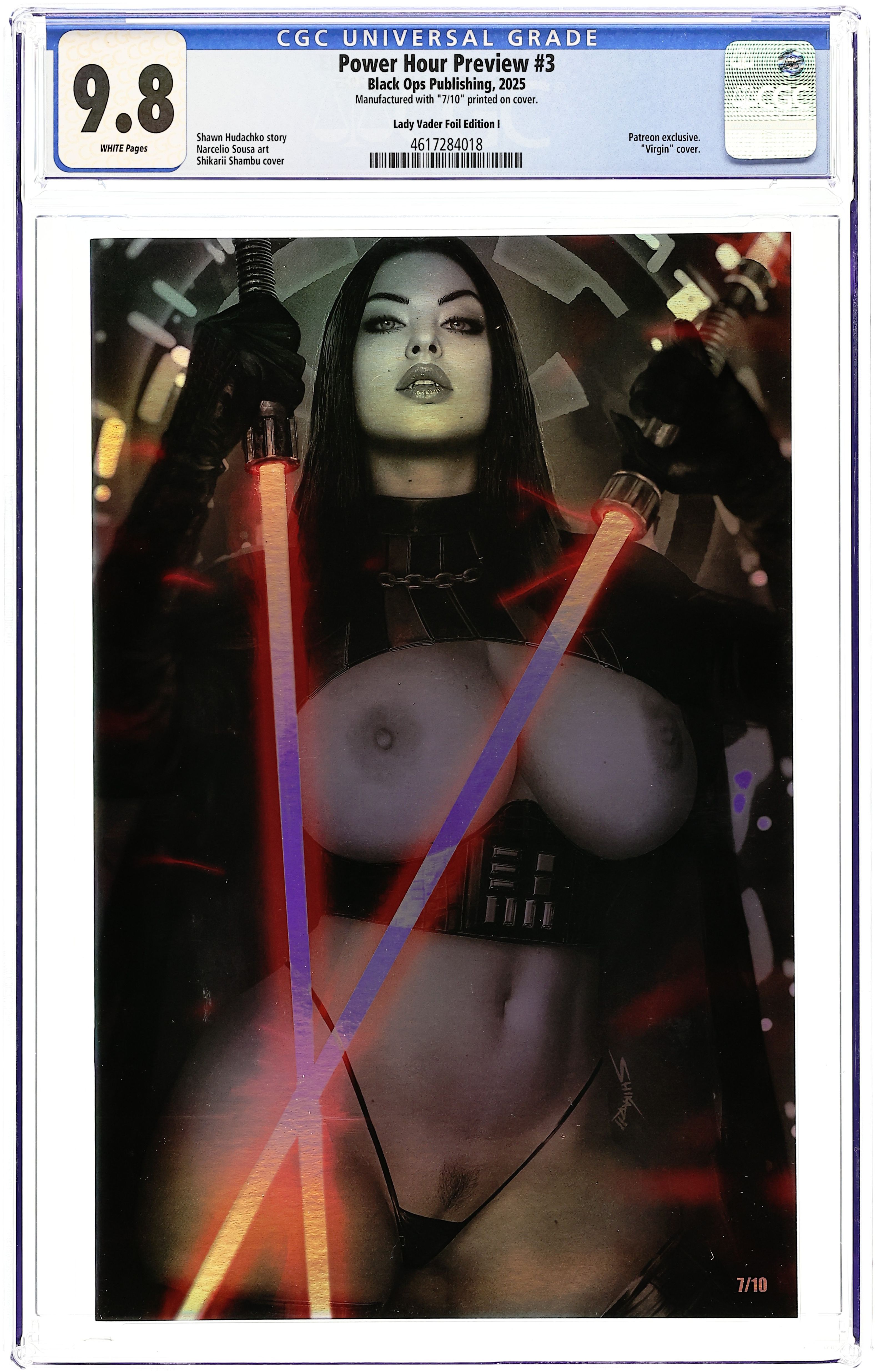Starts Feb 16 Preview Edition. Patreon Exclusive B&W Naughty "Lady Vader" Foil Edition Virgin Cover by Shikarii - limited to 10 copies. Story by Dolan Waddick and Shawn Hudachko. Art by Narcelio Sousa and Ale Garza. 24 pages, full color. Grade: CGC 9.8 explanation of grade Condition: Used (collectible) unless item is a new release