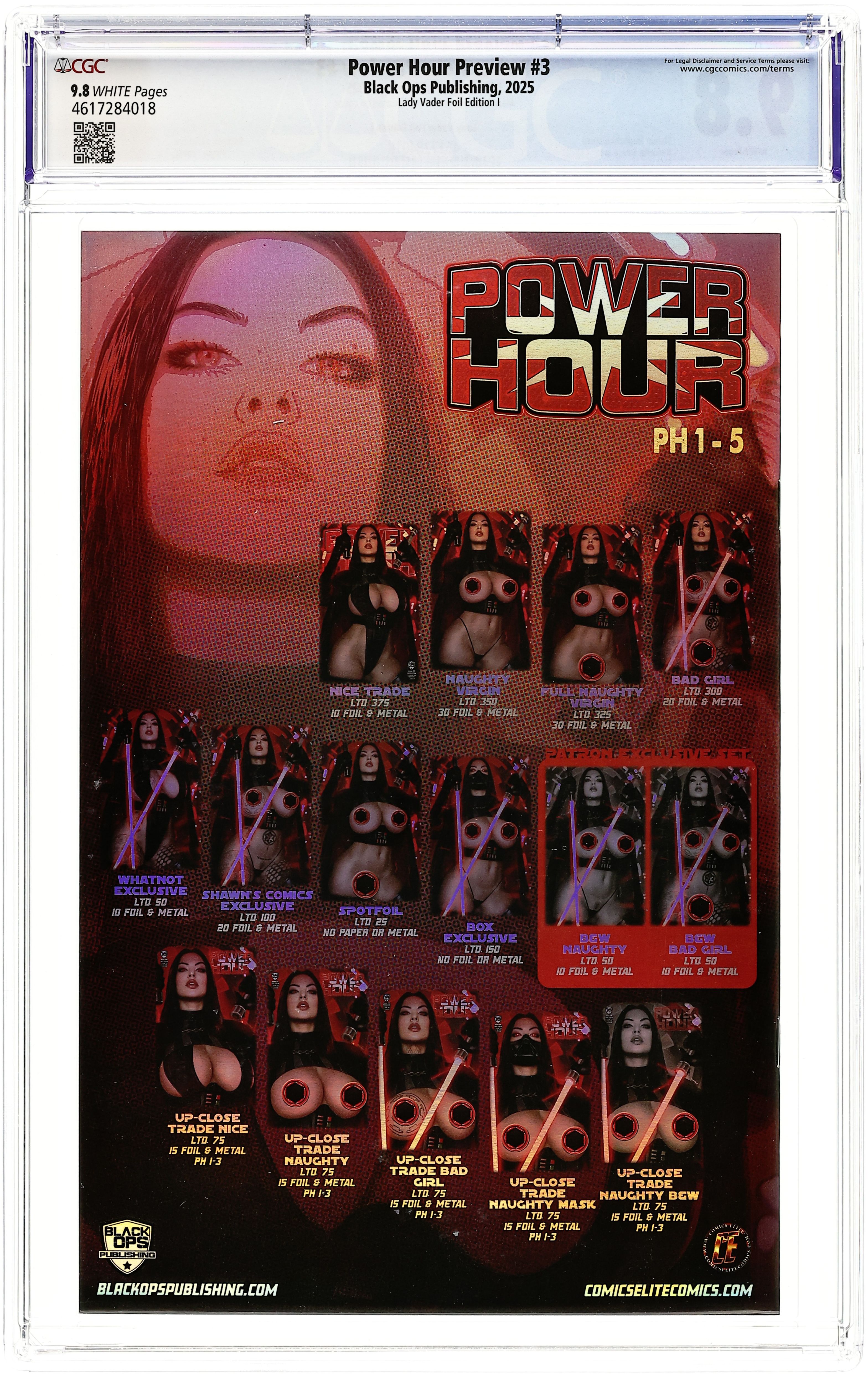 Published 2025 by Black Ops Publishing.Power Hour (2022 Black Ops) Preview Edition 3LADYVADER.I.FOIL CGC 9.8