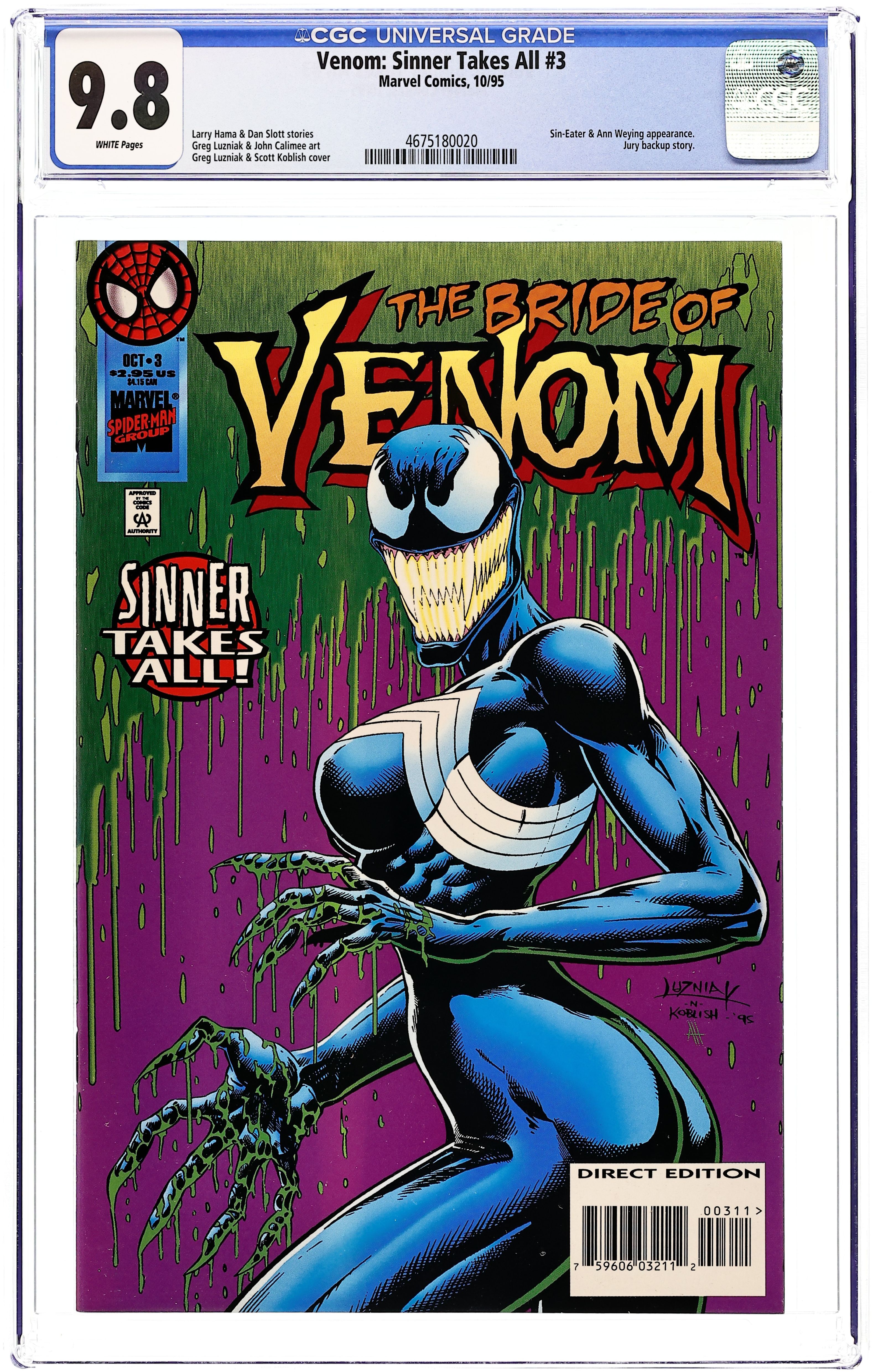 The badly scorched Venom gets burned again when he realizes he's hunting the wrong man! Will Sin-Eater feast on Eddie's loved ones? Written by Larry Hama. Art by Greg Luzniak, Jimmy Palmiotti and Ken Branch. And in the back-up, the Jury is in! Cover by Greg Luzniak and Scott Koblish. 48 pages. Cover price $2.95. Grade: CGC 9.8 explanation of grade Condition: Used (collectible)