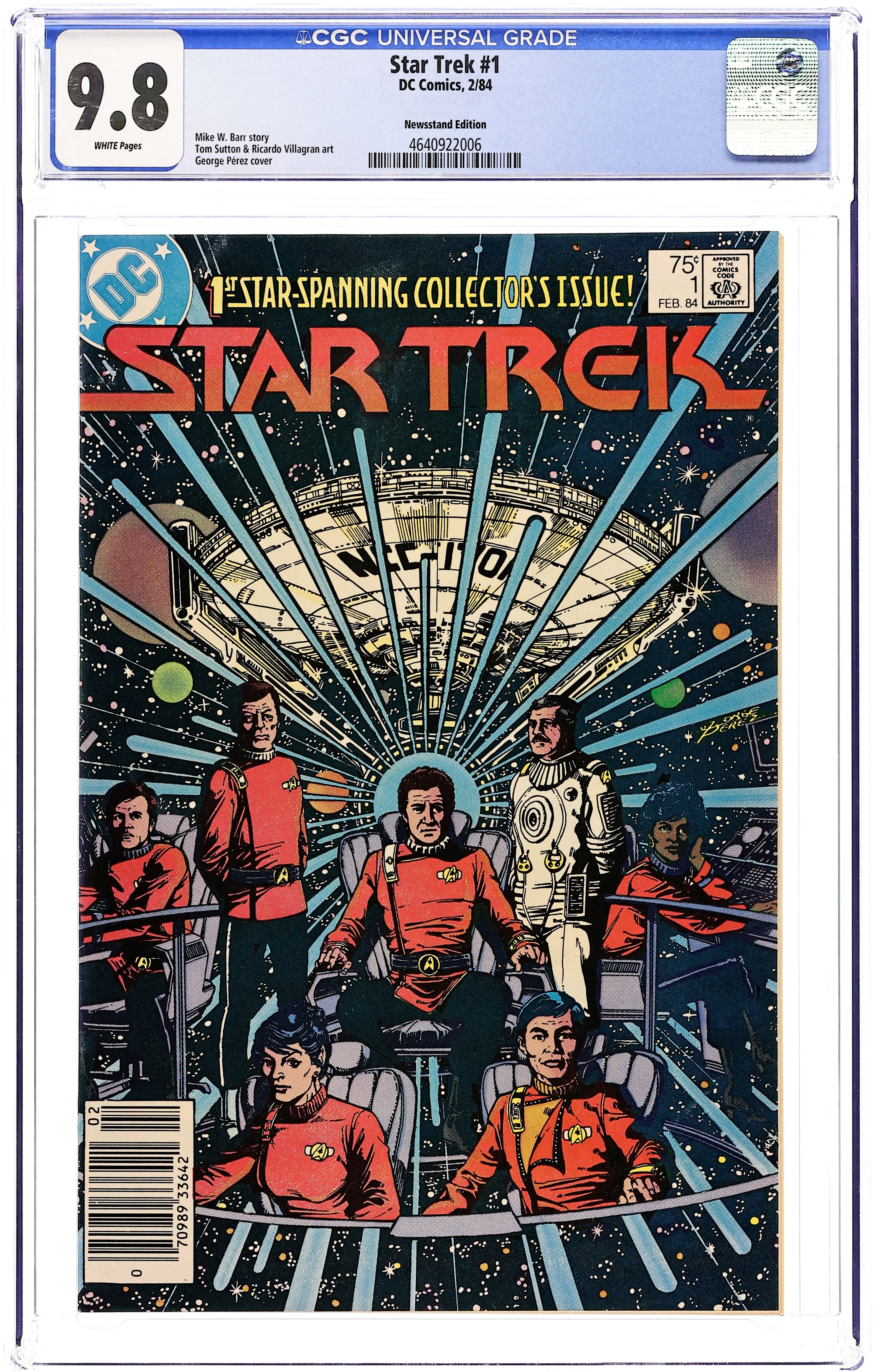 Newsstand Edition. Kirk, Bones, Scotty, Uhura, Sulu and Saavik lead the crew of the U.S.S. Enterprise in search of the Klingons in "The Wormhole Connection". Part 1 of 4, continued next issue. Script by Mike W. Barr, pencils by Tom Sutton, inks by Ricardo Villagran. Marv Wolfman edits. U.S.S. Gallant appears. In Trek continuity, series starts after the events of the film Star Trek II: The Wrath Of Khan. George Perez cover. Cover price $0.75. Grade: CGC 9.8 explanation of grade Condition: Used (collectible)