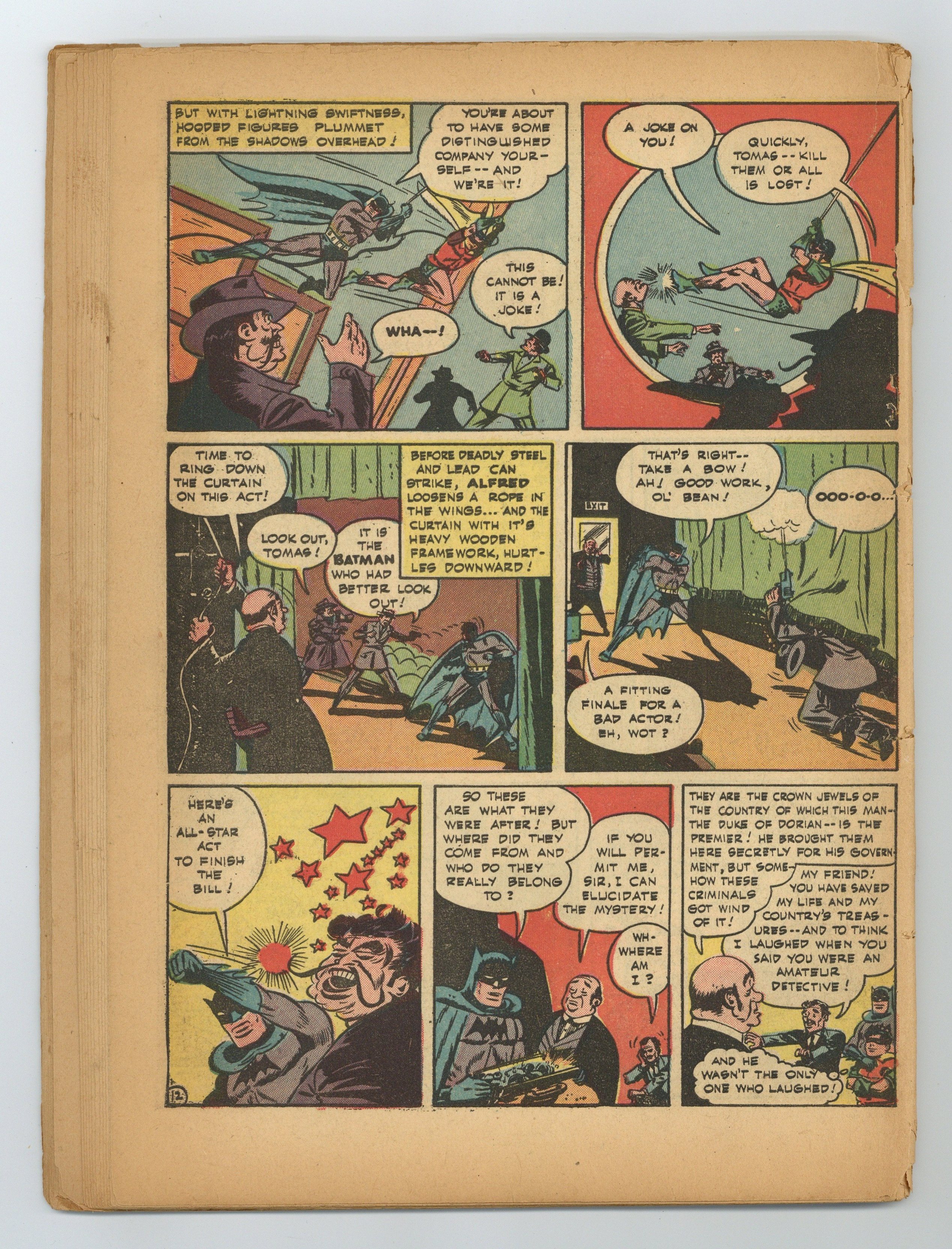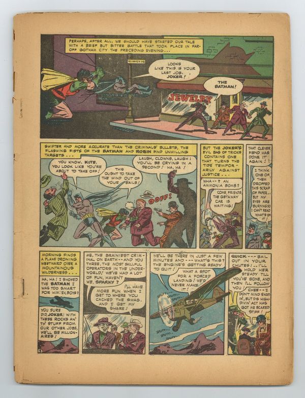 1st appearance of Alfred Pennyworth - Cover by Jerry Robinson. "The Joker Reforms!", script by Don Cameron, pencils by Bob Kane, inks by Jerry Robinson and George Roussos; After robbing a jewelry store, the Joker crash-lands his escape plane and loses his memory; He stumbles into a town where he becomes a hero... but not to the other members of his gang, who seek the jewels, and come looking for him, as do the Caped Crusaders. One-page Shorty story by Henry Boltinoff. "The Grade A Crimes!", script by Ruth "Bunny" Lyons Kaufman (as Bunny Lyons), pencils by Jack Burnley, inks by Jack Burnley and Ray Burnley (backgrounds); After a series of early-bird robberies, Batman notes the appearances of a milkman and his horse-drawn wagon at the scene of every crime, and makes the connection that it is involved in the heists. "The Adventure of the Branded Tree!", script by Don Cameron, pencils by Jack Burnley, inks by Jack Burnley and Ray Burnley (backgrounds); Batman and Robin track down the secret of a dagger-branded tree that led to the murder of two lumberjacks. "Motive" text story by Eric Carter. One-page Clancy the Cop story by Henry Boltinoff. "Here Comes Alfred!", script by Don Cameron, pencils by Bob Kane, inks by Jerry Robinson and George Roussos (backgrounds); Things get very complicated when an English butler, named Alfred, suddenly shows up on the doorstep of Wayne Manor and announces that he is there is attend to their needs in order to fulfill a promise that he made to the original butler for the Wayne family. 68 Pages, Full Color. Cover price $0.10. Grade: Coverless explanation of grade Condition: Used (collectible)
