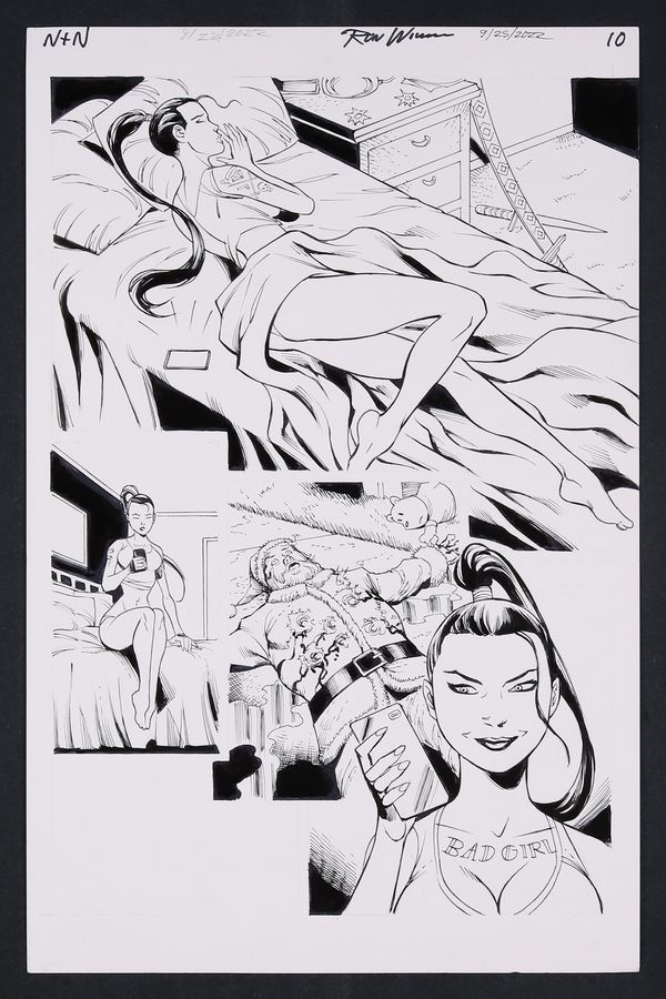 And all through the house, not a creature was stirring, not even Santa Claus. Because he'd been shot multiple times! As Notti dreams of sugar plums, she's awoken by a text from her partner Nyce letting her know that the target has been eliminated. Signed by the artist in top margin. Pencil and ink on art board. 11" x 17".