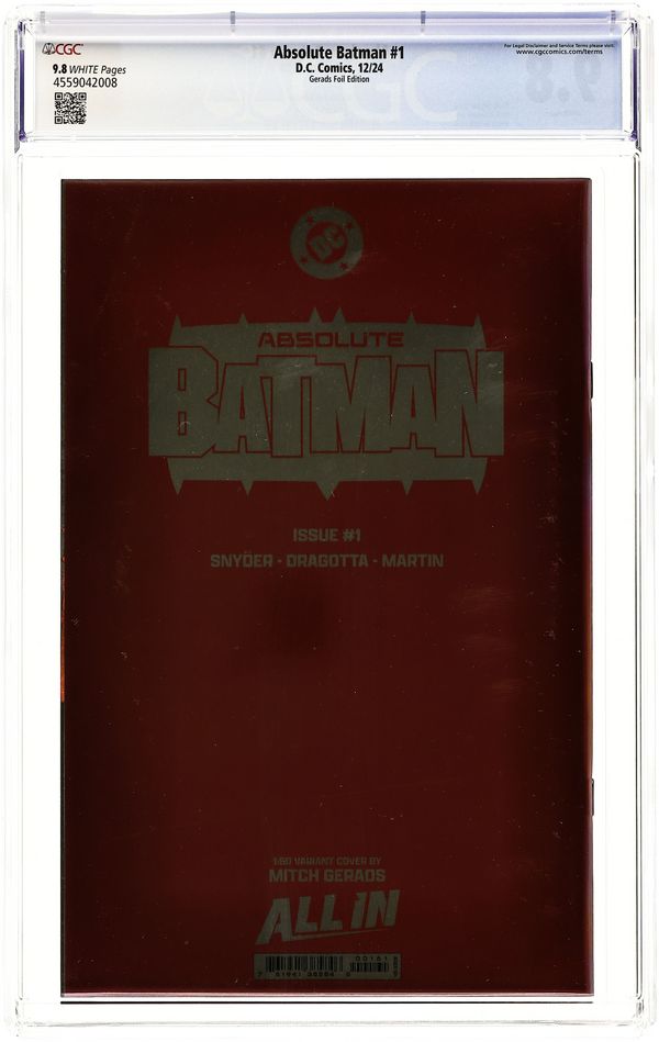Limited 1 for 50 Retailer Incentive Variant Cover. Written by Scott Snyder. Art by Nick Dragotta. Cover by Mitch Gerads. BATMAN LEGEND SCOTT SNYDER AND ICONIC ARTIST NICK DRAGOTTA TRANSFORM THE DARK KNIGHT'S TALE FOR THE MODERN AGE! Without the mansion...without the money...without the butler...what's left is the Absolute Dark Knight! 48 pages, full color. Rated T+ Cover price $5.99. Grade: CGC 9.8 explanation of grade Condition: Used (collectible)