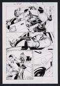 A great action page from this Lady Blackhawk spotlight story! Mourning the recent death of Big Barda in her own way (getting wasted at a bar, starting a fight, and then hijacking a cab in Metropolis to take her to California), Zinda and her unwilling chauffeur are suddenly attacked by False Face and White Star. The highlight here is the third panel with a great image of Lady Blackhawk in a stone cold western gunfighter pose just before she effortlessly hits the cab's gas tank, buying herself some time to escape. Pencil and ink on DC Comics art board. 11 1/2" x 17".