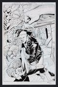 - "Somebody find Gardner!" reads the opening caption on this page, coming from John Stewart on Mogo. Turns out Guy Gardner is right where you might expect him to be, on a backwater world sans Ring and looking for a fight. An absolutely fantastic page, opening with a a brutal close shot of Guy's fist making impact before revealing Gardner in all his glory! Signed by the artist in lower right margin. Blue line pencil and ink on DC Comics art board. 11" x 17".