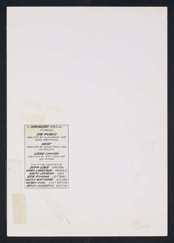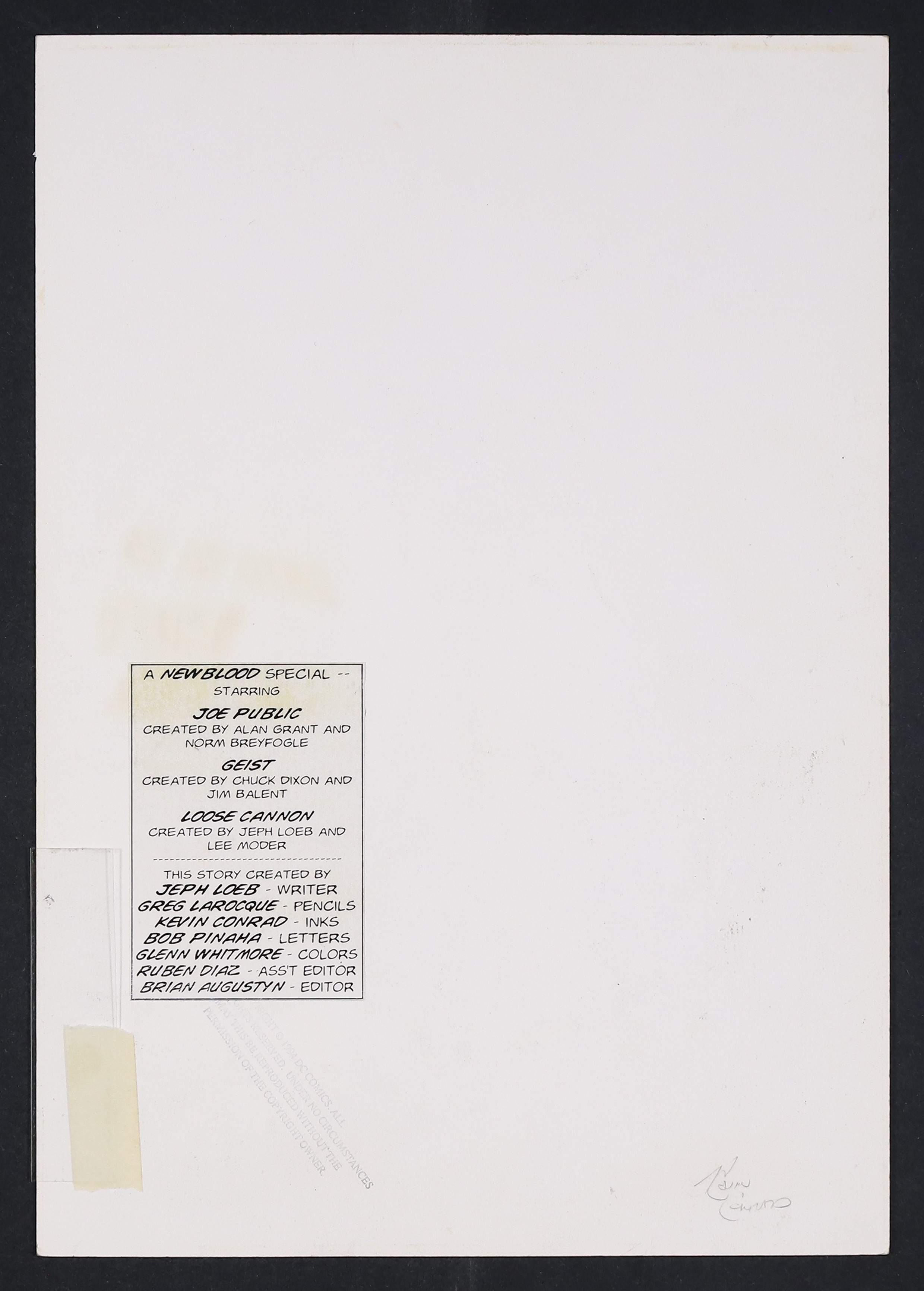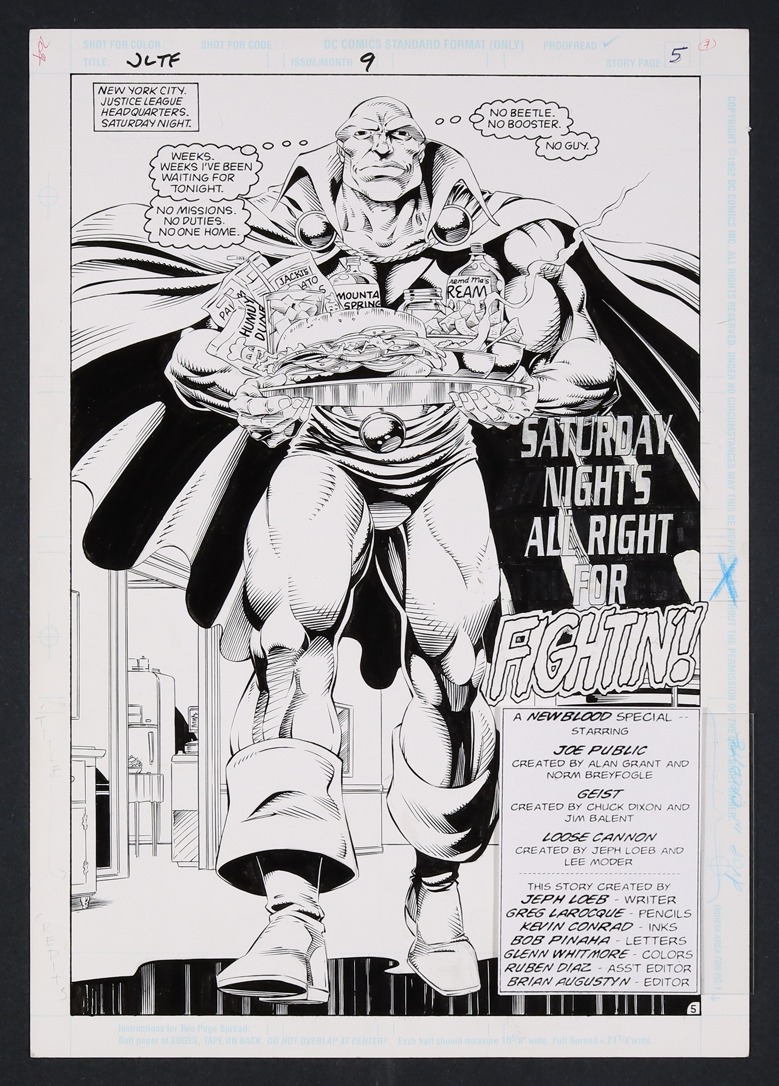 A delightful title page splash that promises a bit of irony coming J'onn's way as the Martian Manhunter prepares for a cozy night in! Though Justice League comics were beginning to leave the Bwa-Ha-Ha era behind, its influence is still felt here! Signed by Conrad on the reverse. Pencil and ink on DC Comics art board. 11 1/2" x 16 1/4". NOTE: The credits box appears to be a recreation and affixed to a plastic flap which taped to the reverse with masking tape. Also affixed to the reverse is what may be the original credits box which is glued to the board.