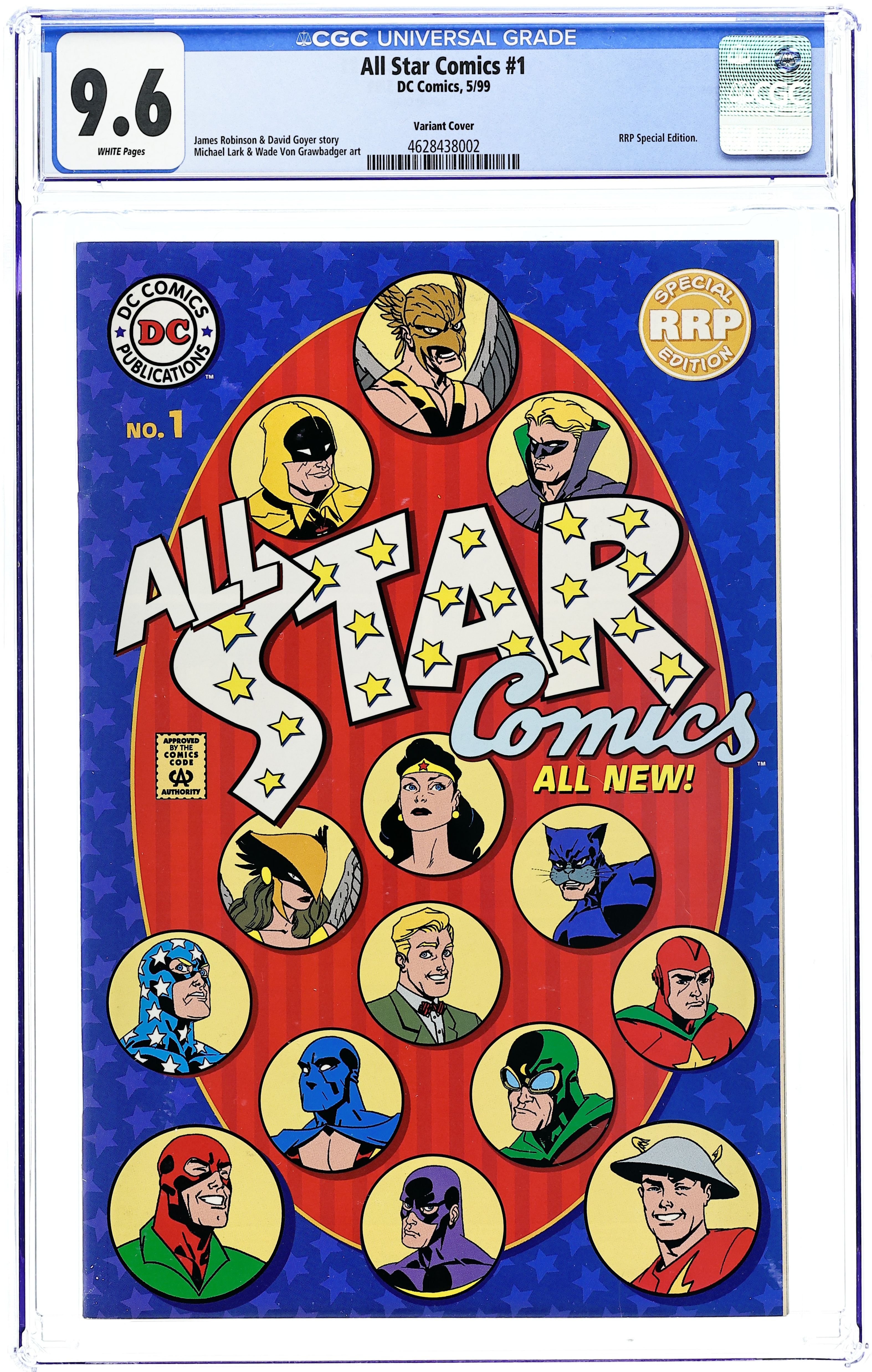Golden Age Justice Society story by James Robinson and David Goyer with art by Michael Lark. Variant edition, no cover price, blank inside front and back covers, May 1999 dated Retailer Representative Edition (RRP). Grade: CGC 9.6 explanation of grade Condition: Used (collectible)