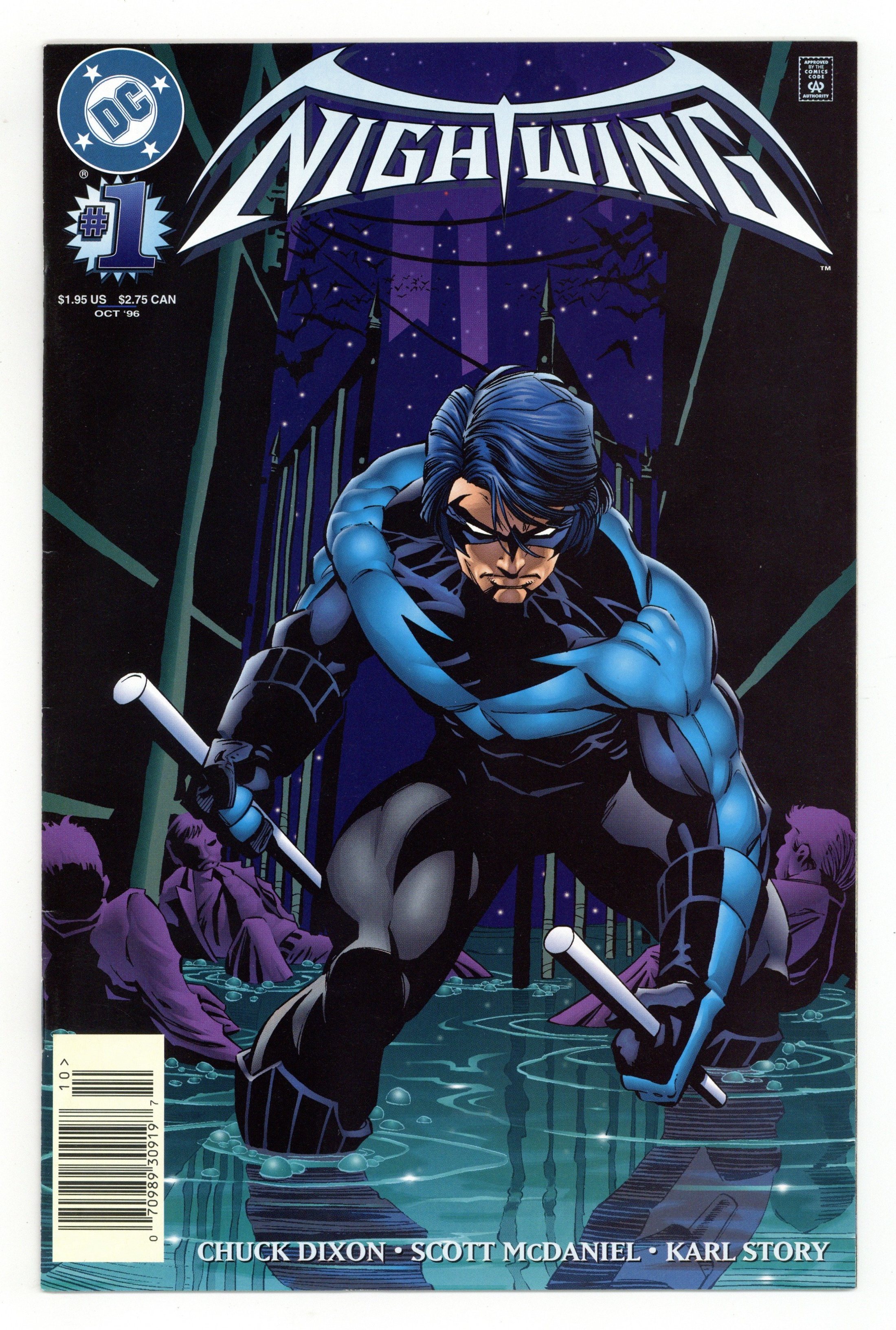 Starts Feb 23 Newsstand Edition. Child of Justice - Written by Chuck Dixon. Art by Scott McDaniel & Karl Story. Cover by Scott McDaniel & Scott Hanna. In his own ongoing series at last: Frequent Batman ally Nightwing takes matters into his own hands in a new city that is in desperate need of a hero. But the upper echelons of both political and criminal power in the city of Bludhaven will not tolerate the intrusion of a costumed vigilante. Nightwing's efforts to shatter Bludhaven's corruption and organized crime are obstructed at every turn by vicious killers, angry cops, and the mysterious mastermind behind the city's woes. 32 pages, full color. Cover price $1.95. Grade: FN/VF 7.0 explanation of grade Condition: Used (collectible)