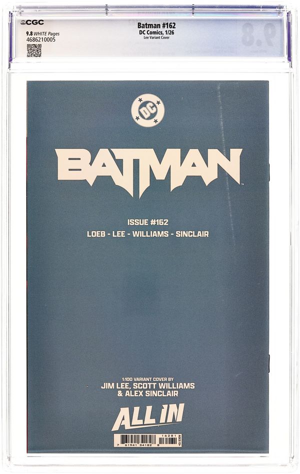 Starts Apr 4 Limited 1 for 100 Retailer Incentive Variant Cover. (W) Jeph Loeb (A) Jim Lee (CA) Jim Lee H2SH WITH JEPH LOEB AND JIM LEE PART 5! Batman versus the Bat-Family! Whose side are you on? Cover price $5.99. Grade: CGC 9.8 explanation of grade Condition: Used (collectible)