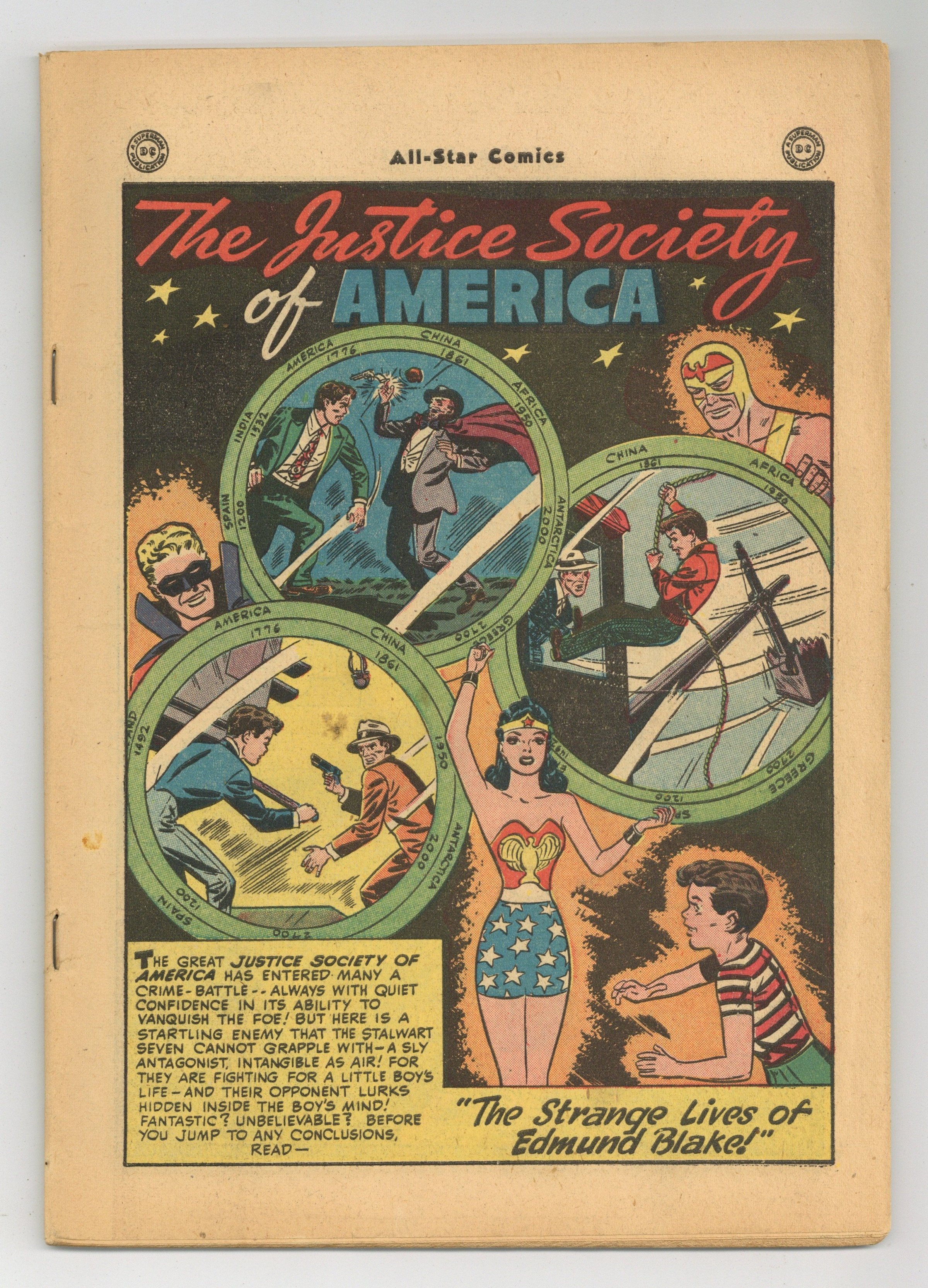 Starts Apr 4 The Justice Society of America star in "The Strange Lives of Edmund Blake!" Script by John Broome, pencils by Arthur Peddy (splash page and chapters 1 and 3) and Irwin Hasen (chapter 2), inks by Bernard Sachs (splash and chapters 1 and 3) and Bob Oksner (chapter 2). Back-up Johnny Peril's Surprise Story, "The Littlest Planet!" Two-page article, "Frontier Surgeon," about Ephraim McDowell, by William Irwin. Peddy/Sachs cover. 52 Pages, Full Color. Cover price $0.10. Grade: Coverless explanation of grade Condition: Used (collectible)