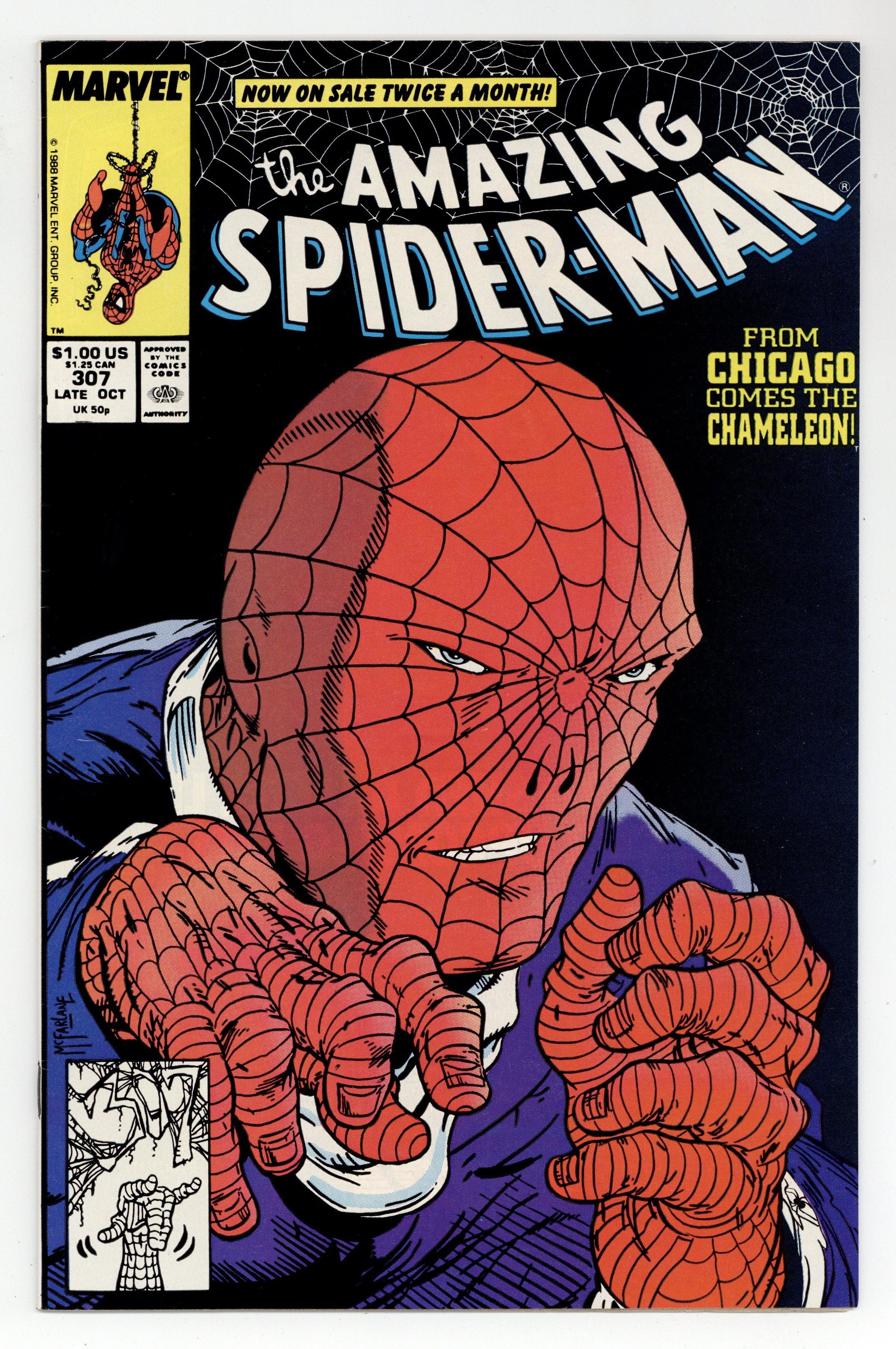 Starts Mar 2 Direct Edition. "The Thief Who Stole Himself!" Script by David Michelinie. Art by Todd McFarlane. Cover by Todd McFarlane. Peter Parker's next stop on his book signing tour is the Windy City! This should be a quick and easy trip to Chicago for the web-slinger! However an old foe from long, long ago elects to embark on a new criminal career in the second city! Can the amazing one capture the Chameleon before his next endeavor begins? Spidey will have to spot him first! In the meantime back in Manhattan, the deranged Jonathan Caesar makes his move on Mary Jane! Hurry home Spider-Man! (Note: The Chameleon previously battled the wall-crawler in Amazing Spider-Man 186.) 36 pages. Cover price $1.00. Grade: VF 8.0 explanation of grade Condition: Used (collectible)