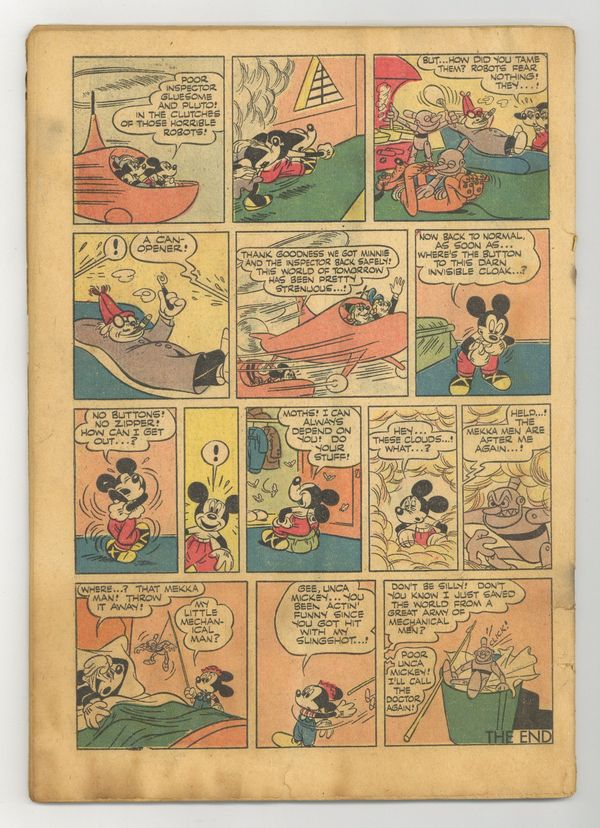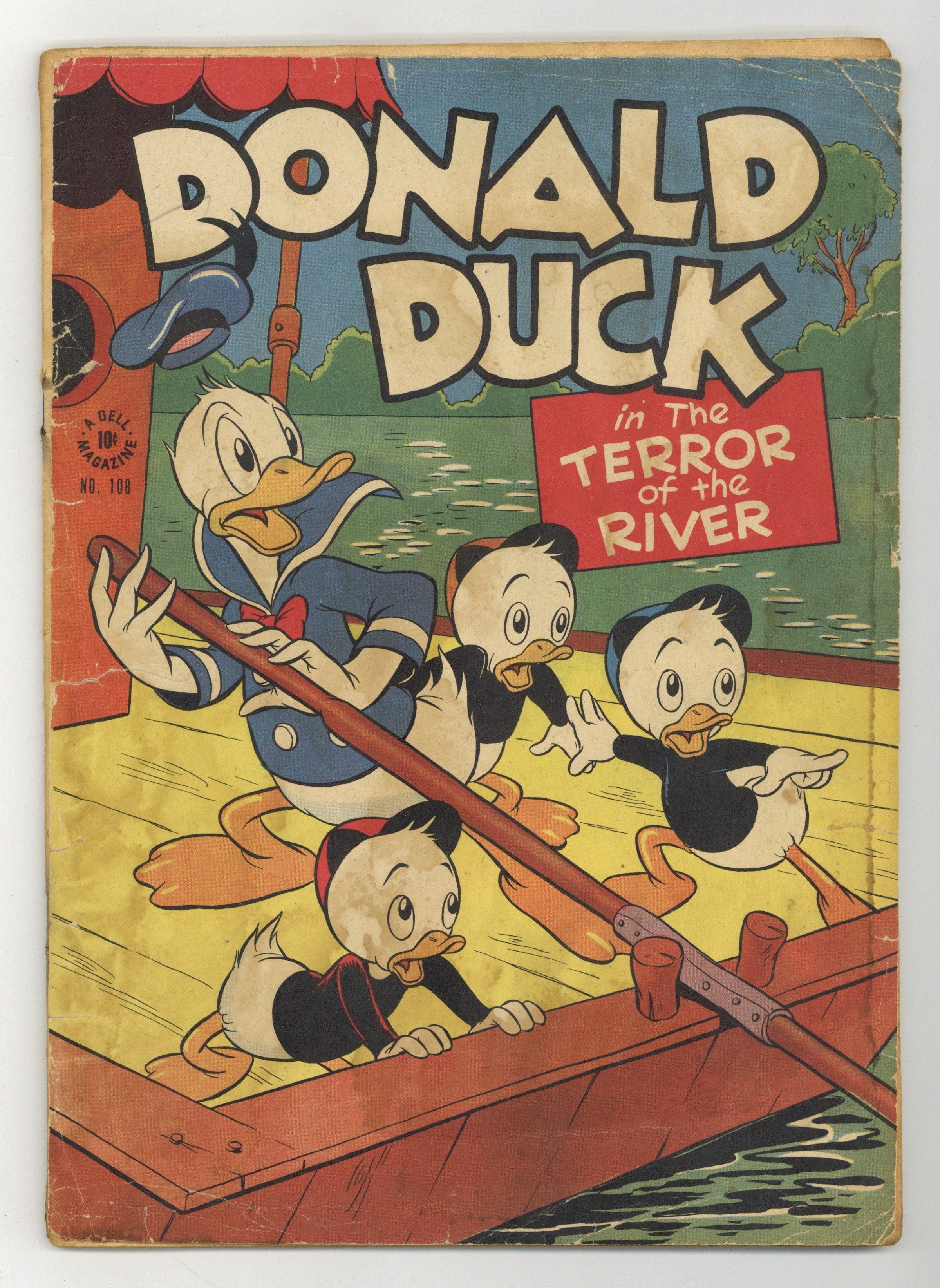 Indicia title is "DONALD DUCK in the Terror of the River, No. 108." Cover art by Carl Buettner. The Terror of the River!!, script and art by Carl Barks; Donald's sneezes at an auction are mistaken for bids on a houseboat and soon he and the nephews are sailing down the Ohio River; There they encounter a huge serpent. The Firebug, script by Carl Barks, art by Carl Barks; Carl Buettner (last two panels only); Donald falls on his head when getting up one morning and turns into a pyromaniac, setting harmless fires but also getting the blame for big fires set by another firebug. Seals Are So Smart, script and art by Carl Barks; The nephews play ball at the beach with a baby seal, and this sets Donald to dreaming of how much money he could make with a trained seal act. 52 pages, full color. Cover price $0.10. Grade: PR 0.5 explanation of grade Condition: Used (collectible)