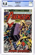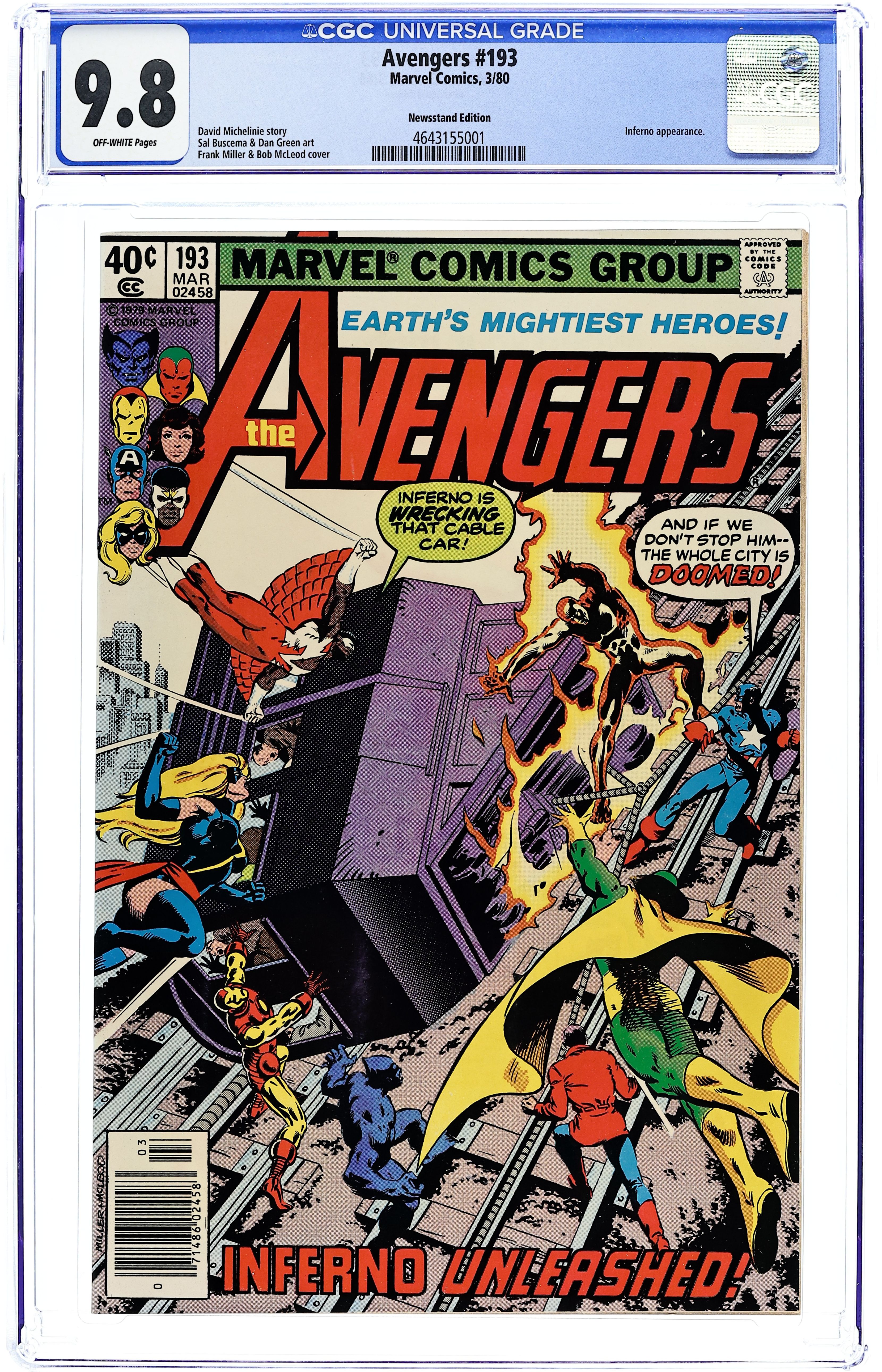 Newsstand Edition. "Battleground: Pittsburgh!" Part 2 of 2. Plot assist by the Pittsburgh Comix Club. Script by David Michelinie. Art by Sal Buscema (layouts), Dan Green (finishes), and Frank Miller (assists). Cover by Frank Miller and Bob McLeod. Inferno is on the loose in the Steel City! Wonder Man and Shell-head couldn't stop him! And now Captain America leads the rest of the Avengers to the Liberty Bridge to battle the fiery villain! But Inferno stays one step ahead of Earth's Mightiest Heroes and tears up the Duquesne Incline on his way to Mount Washington! Will the Avengers ever catch up to the raging Inferno? The letters page in Avengers 197 credits Frank Miller with assisting with the pencils. This issue includes a sideways full-page ad featuring Batroc the Leaper promoting Crazy Magazine. Letters page contains a statement of ownership: average print run 428,935; average paid circulation 217,850. 36 pgs. Cover price $0.40. Grade: CGC 9.8 explanation of grade Condition: Used (collectible)