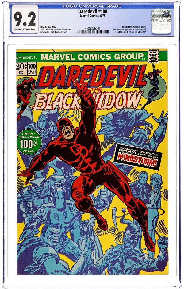 Cover pencils by Rich Buckler, inks by Frank Giacoia. First appearance of Angar the Screamer in Mind Storm!, script by Steve Gerber, pencils by Gene Colan, inks by John Tartaglione; Daredevil returns to San Fran in time to give an impromptu interview to Rolling Stone Magazine during which the whole world goes nuts; Angar shows up to claim responsibility; Daredevil origin retold; appearance by Jann Wenner (editor of Rolling Stone magazine); cameos by the Jester, Leap-Frog, the Matador, Tagak, Doctor Doom, the Gladiator, the Black Widow, Mike Murdock, and a John Lennon poster. 36 pages. Cover price $0.20. Cover price $0.20. Grade: CGC 9.2 explanation of grade Condition: Used (collectible)