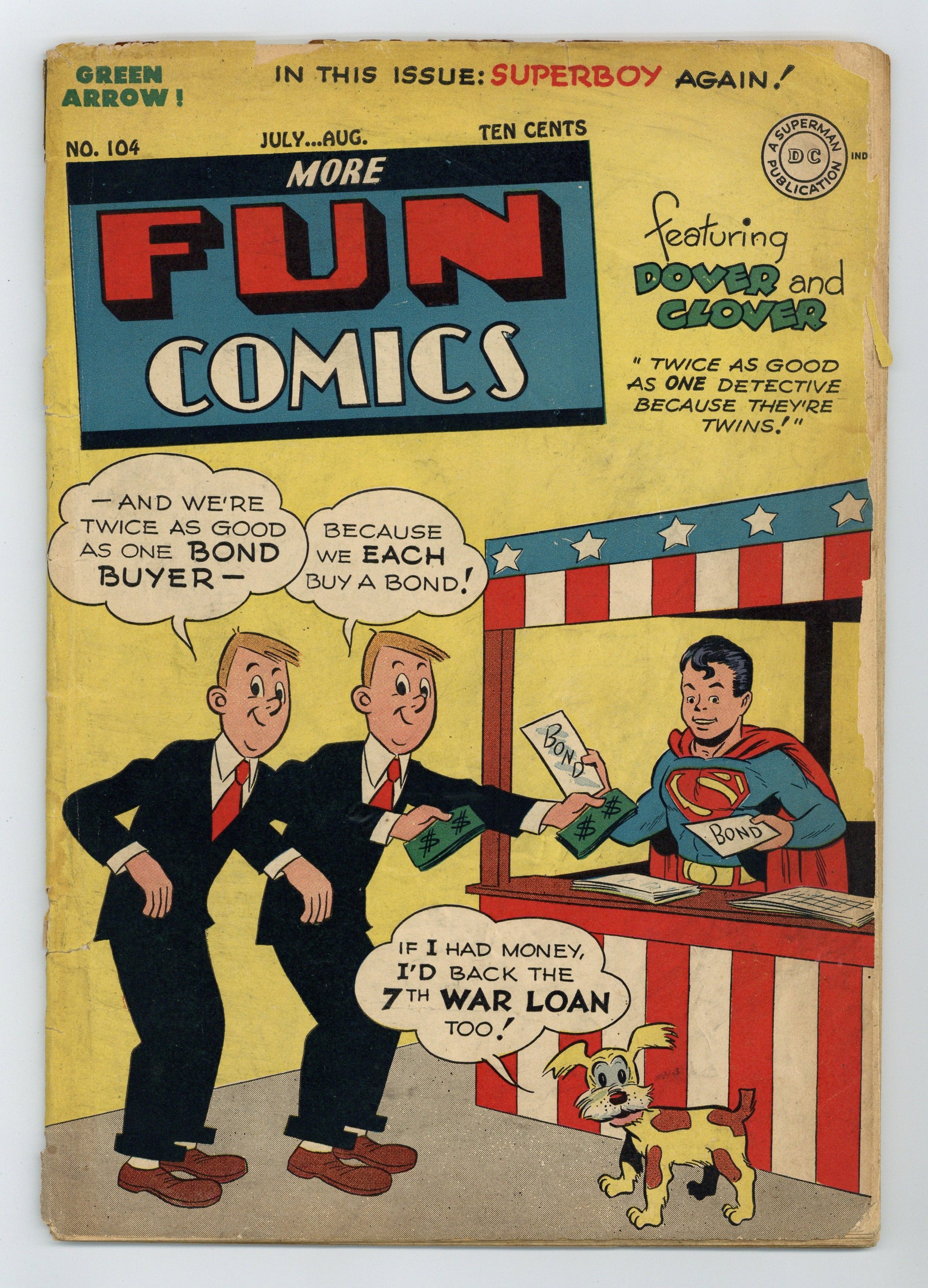 1st Superboy cover. Cover by Henry Boltinoff (Dover and Clover) and Stan Kaye (Superboy). "Merchant of Menace" starring Green Arrow and Speedy, art by Maurice del Bourgo. "Good Hunting," script by Don Cameron (as Jerry Siegel), art by Joe Shuster; When Johnny and his mother are going to be evicted from their home, Johnny decides to go out and discover something valuable to help pay down the mortgage; However, when he discovers the men responsible for the situation he and his mother finds themselves in, it is Superboy that must take a hand and save Johnny from certain death. "The Missing Musicians" starring Johnny Quick, art by Mort Meskin (as Mort Morton Jr.). "Railroad Roundup" starring Dover and Clover, art by Henry Boltinoff. "The Great Goldfish Bowl," art by Louis Cazeneuve; A millionaire commissions Aquaman to find his nephew's pet goldfish. 52 pgs., full color. $0.10. Cover price $0.10. Grade: PR 0.5 explanation of grade Condition: Used (collectible)