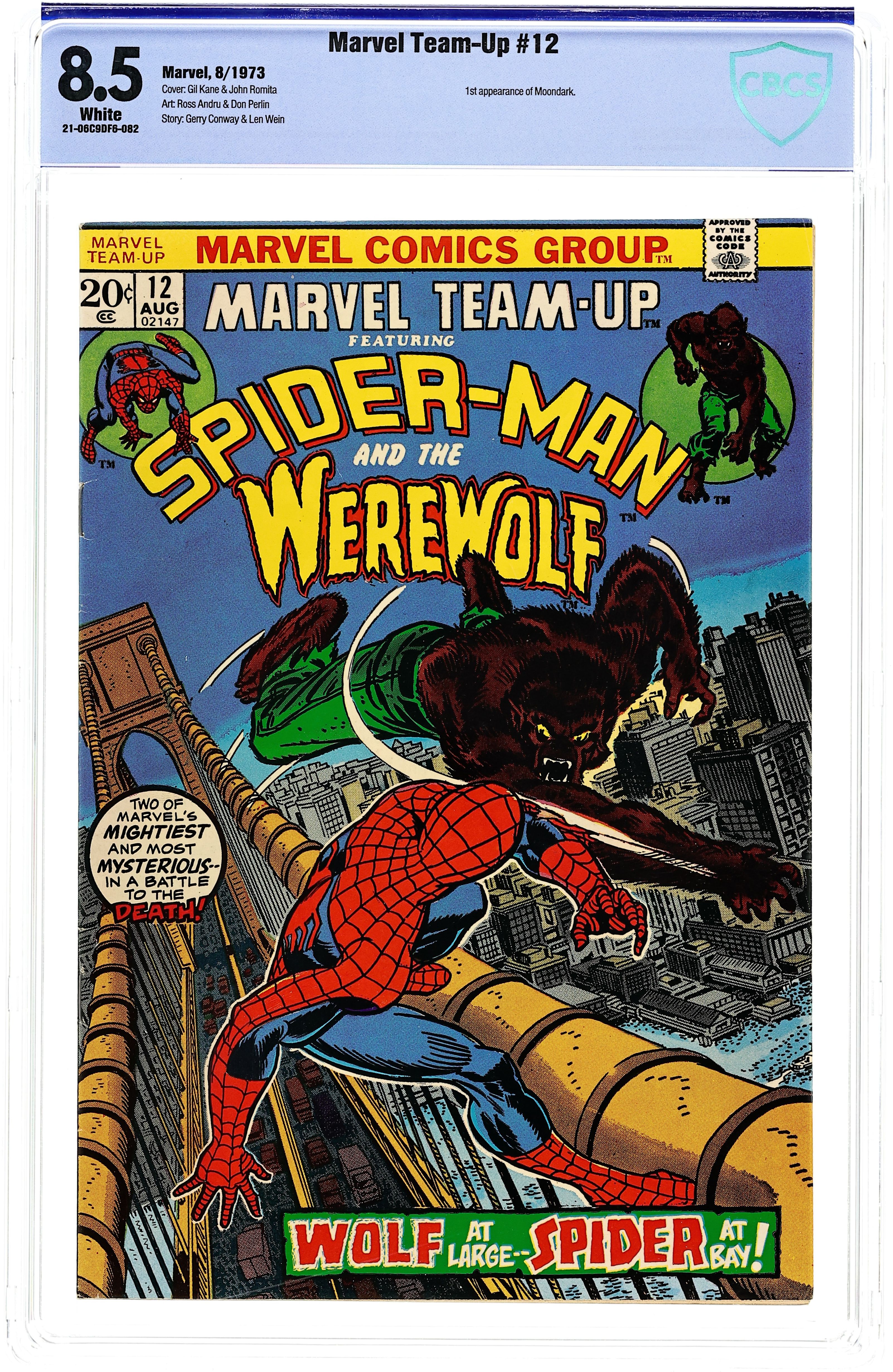 Starts Mar 9 "Wolf at Bay" Guest-starring Spider-Man and Werewolf by Night. Plot by Gerry Conway. Script by Len Wein. Pencils by Ross Andru. Inks by Don Perlin. Cover by Gil Kane and John Romita. The Amazing Spider-Man is web-swinging across the Golden Gate Bridge...when he's suddenly attacked by a werewolf! And it's not just any werewolf -- it's Jack Russell aka Werewolf by Night! A strange magician -- named Moondark -- has seized control of the Werewolf...and sent him to kill the web-slinger! Can Spidey break Moondark's control of Jack...before they both wind up at the bottom of the bay? First appearance of Moondark. Cameo appearances by Buck Cowan and Lissa Russell. Flashback cameos by J. Jonah Jameson and Joe Robertson to explain why Peter Parker is in San Francisco. (Notes: Peter's assignment for the Daily Bugle continues in Daredevil 103. Moondark returns in Marvel Team-Up #91. This story takes place after Amazing Spider-Man 123.) 36 pages. Cover price $0.20. Grade: CBCS 8.5 explanation of grade Condition: Used (collectible)