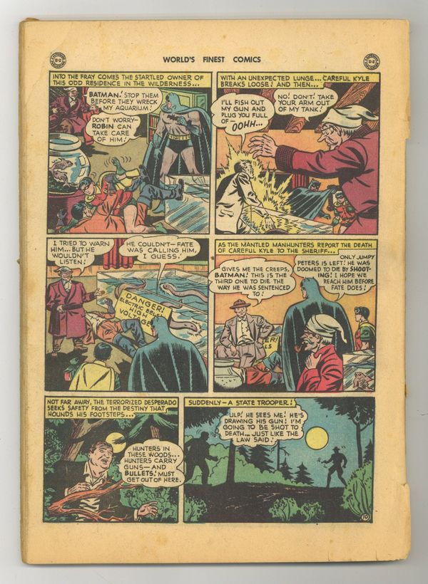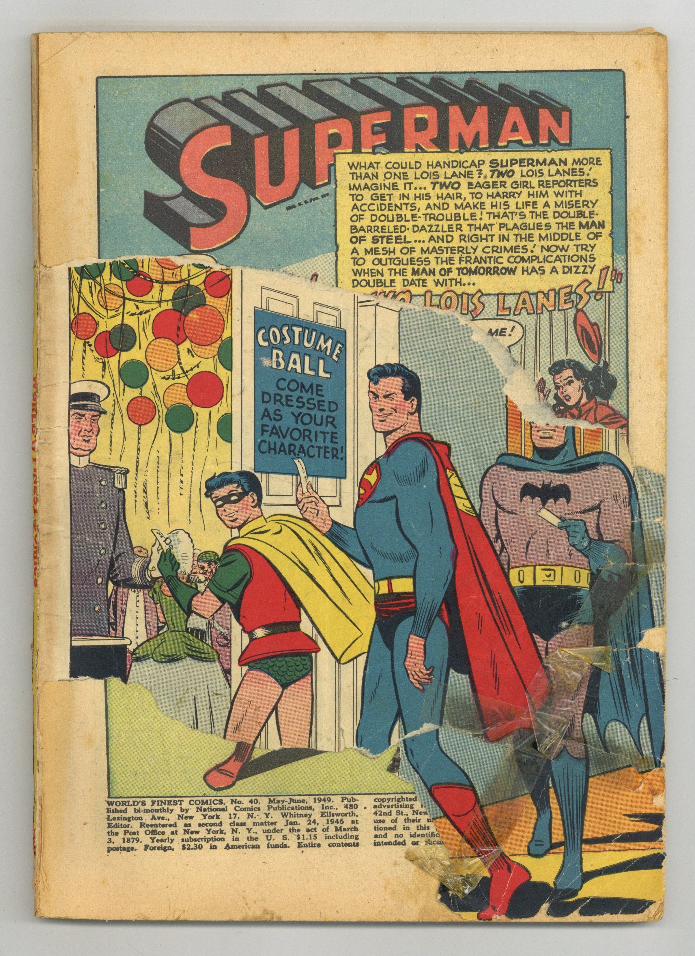 Cover art by Win Mortimer. The Two Lois Lanes starring Superman, art by Al Plastino; Criminals use a double of Lois to distract Superman; Superman uses his strength to squeeze coal into a diamond. A Day In The Life of Robin Hood, script by Otto Binder, art by George Papp; Green Arrow switches places in time with Robin Hood. Ben Hur Wins a Race starring Doc & Fatty, art by Howard Sherman. The Handcuffs of Fate starring Boy Commandos, pencils by Carmine Infantino, inks by Frank Giacoia. Peg humor page by Henry Boltinoff. The Danger Sign starring Zatara, script by George Kashdan, art by Joe Kubert. Bebe two-pager by Henry Boltinoff. Foreign Flags Over America text article, script by William I. Irwin, art by Raymond Perry. 4 Killers Against Fate starring Batman, art by Jim Mooney. 76 Pages, Full Color. Cover price $0.15. Grade: PR 0.5 explanation of grade Condition: Used (collectible)