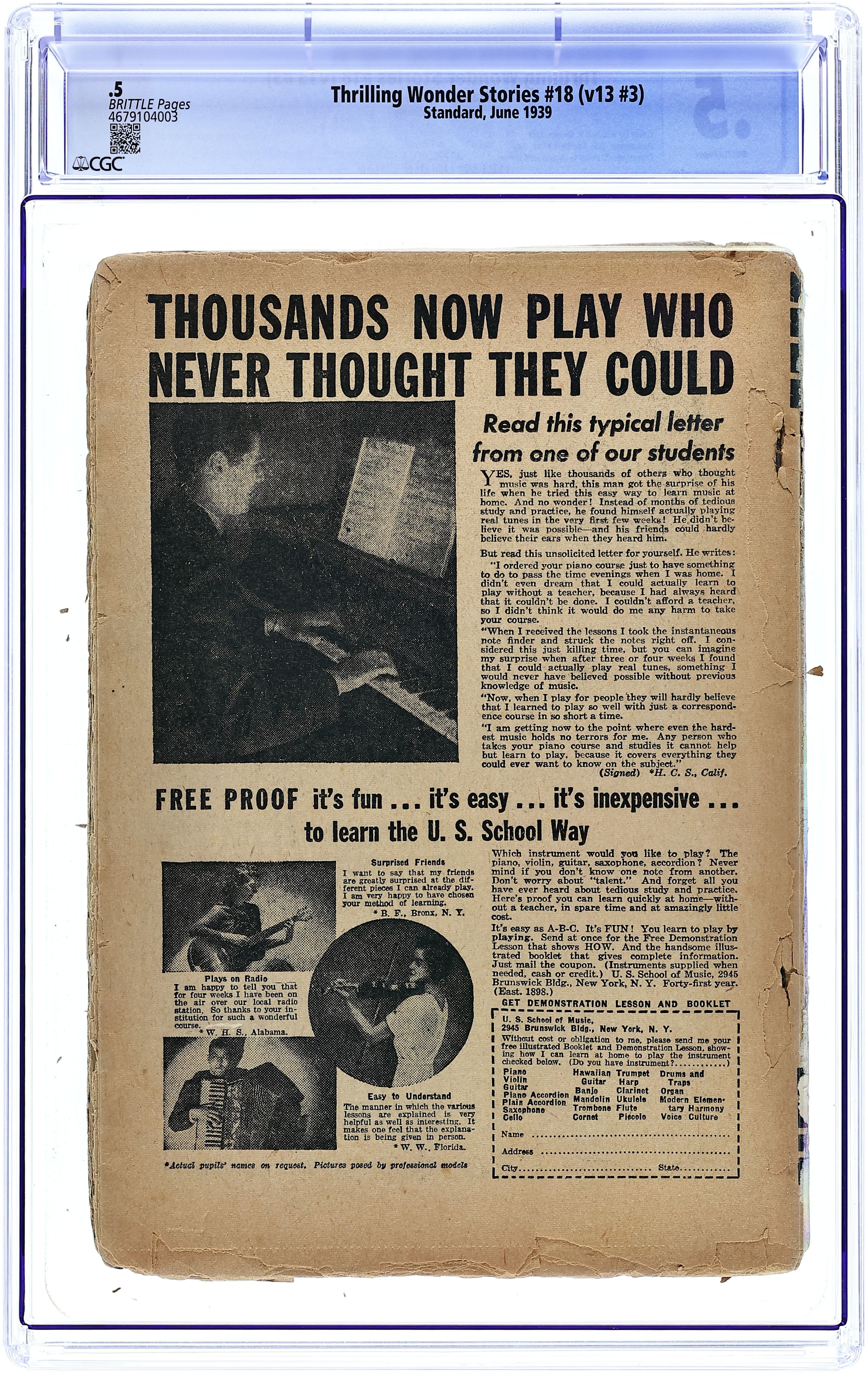 Starts Later today June 1939. 10th Anniversary Issue. Stories by John Taine, Stanley G. Weinbaum, Jack Williamson, David H. Keller, Edward Elmer Smith, Eando Binder, John C. Burroughs and Hulbert Burroughs, and Otis Adelbert Kline. Virgil Finlay (3) and Alex Schomburg illustrations. 7-in. x 10-in.; black and white; 134 newsprint pages. Cover price $0.15. Grade: CGC 0.5 explanation of grade Condition: Used (collectible)