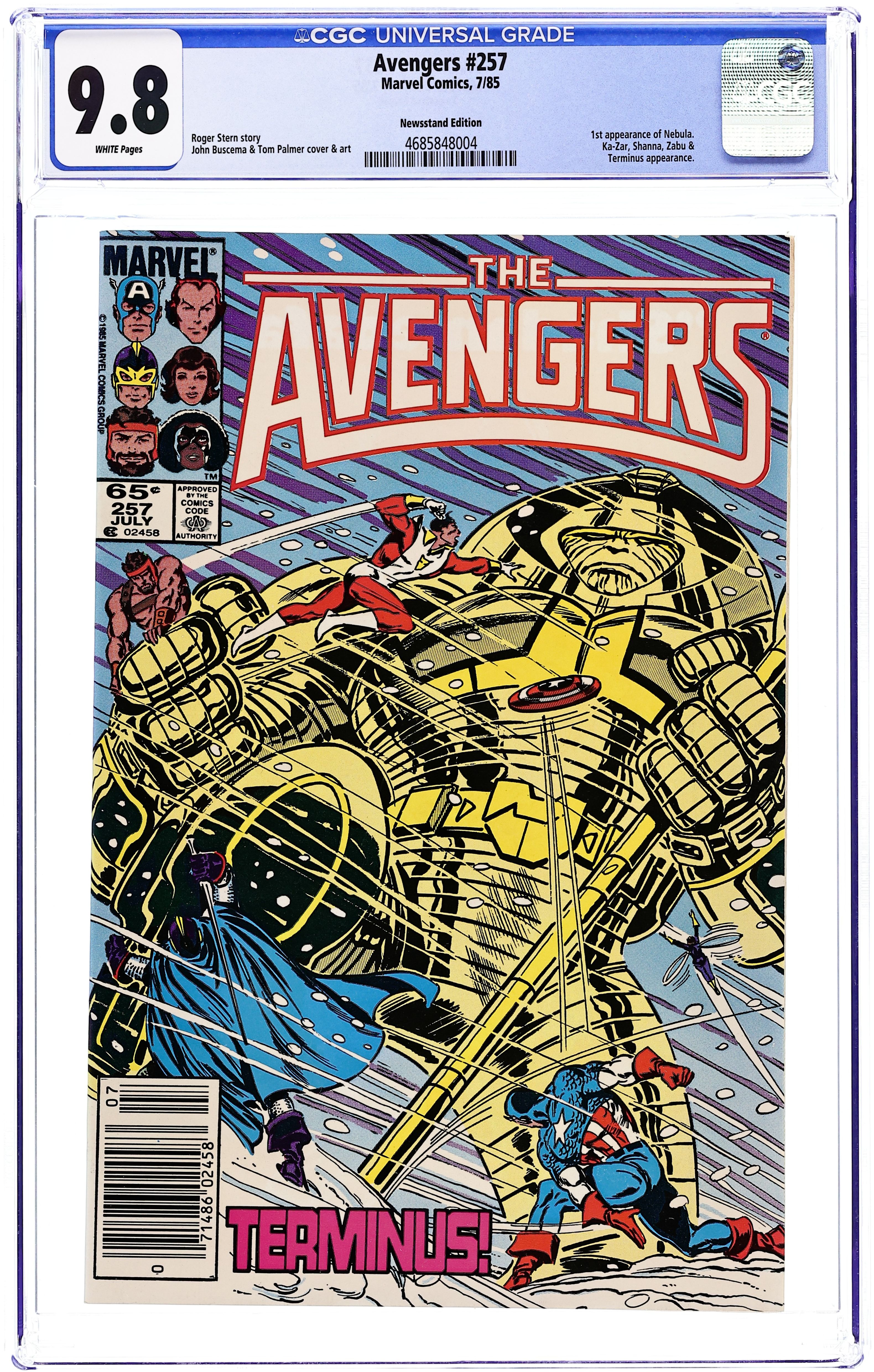 Newsstand Edition. "Holocaust in a Hidden Land!" Part 2 of 2. Guest-starring Ka-Zar and Shanna. Script by Roger Stern. Art by John Buscema (breakdowns) and Tom Palmer (finishes). Cover by John Buscema and Tom Palmer. Terminus is on a rampage through the Savage Land! And only Earth's Mightiest Heroes stand between the powerful alien and the utter destruction of the bottom of the world! Will the combined might of the Black Knight, shield-slinger, Starfox, Wasp, and Prince of Power be enough to prevent the annihilation of the hidden paradise? Or will Antarctica, centuries later, finally reclaim the Savage Land? A cold and bitter ending for Ka-Zar and the Avengers! Meanwhile light years away in outer space, Captain Marvel meets a new super-villain that will battle the Avengers for years to come! First appearance of Nebula. (Notes: The Savage Land first appeared in Uncanny X-Men (1st series) 10. The High Evolutionary attempts to restore the Savage Land in Uncanny X-Men Annual 12. This issue includes a full-page ad for the Secret Wars II Limited Series.) 36 pages Cover price $0.65. Grade: CGC 9.8 explanation of grade Condition: Used (collectible)